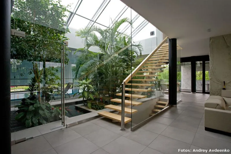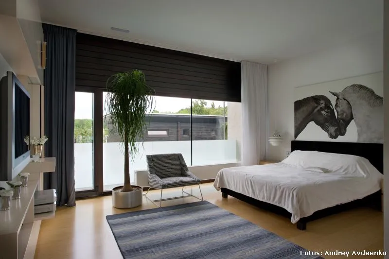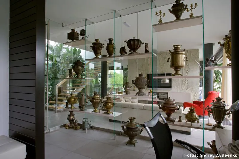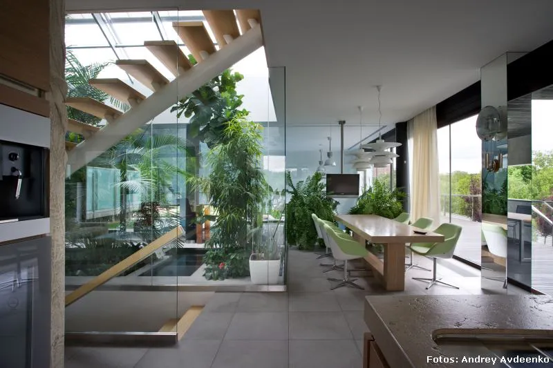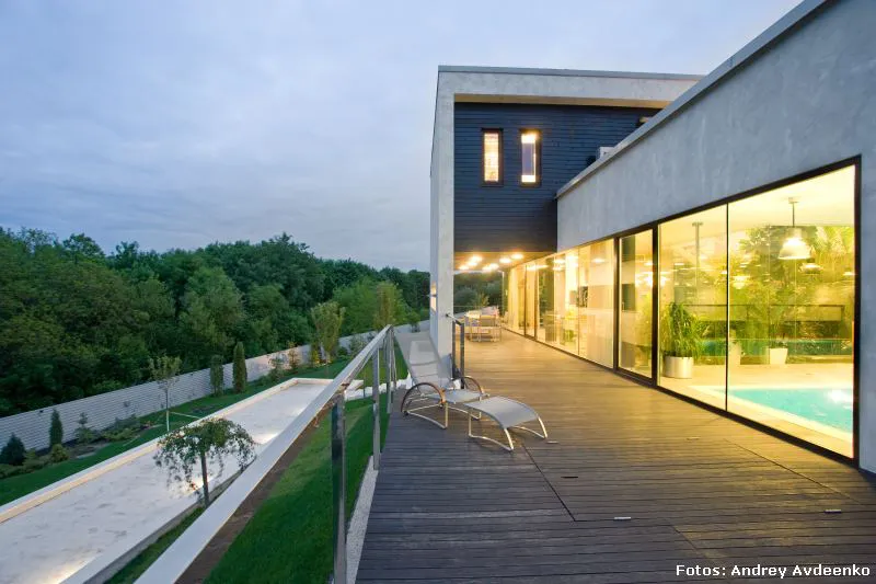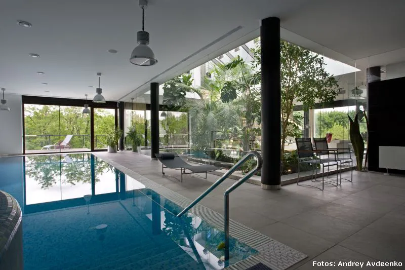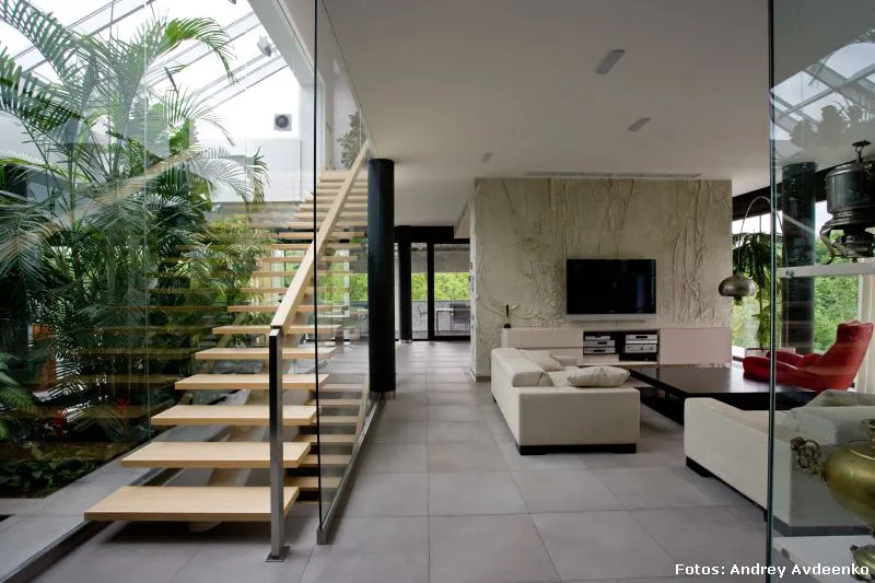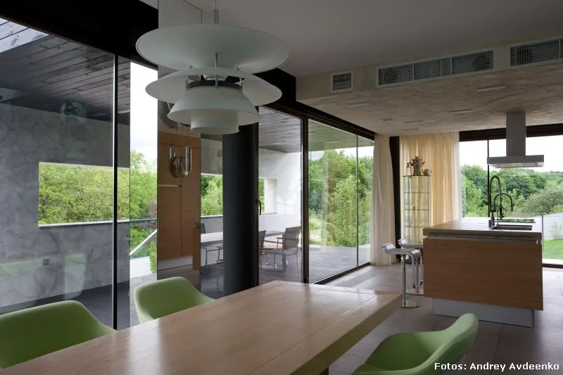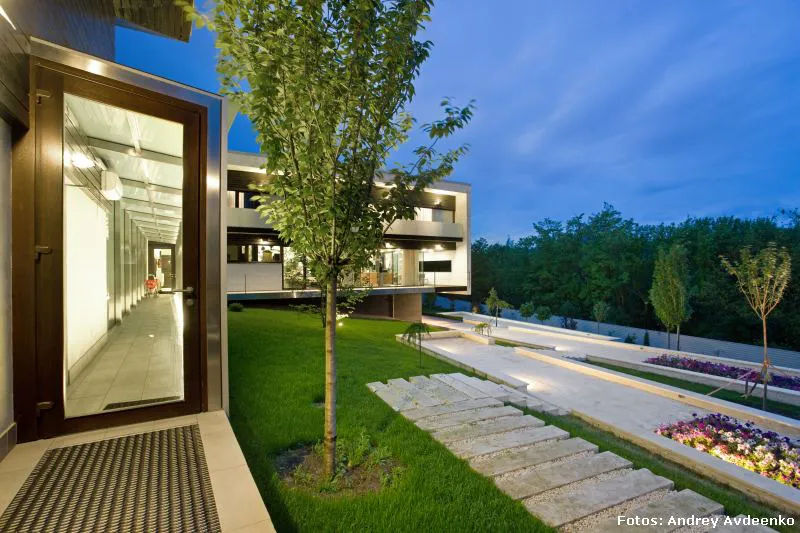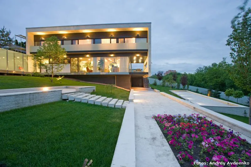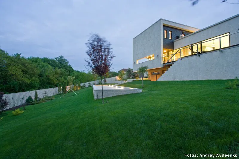 Járkov se encuentra en el noreste de Ucrania y es la segunda ciudad más grande del país (la primera es Kiev, su capital). También es uno de sus principales centros industriales, culturales y educacionales. Allí, en un barrio privado de las afueras, se levanta esta vivienda unifamiliar de nada menos que 513 m² construidos sobre un terreno que suma al privilegio de la vastedad de sus dimensiones, el hecho de que su verde enormidad es visualmente acrecentada gracias a la prolífica vecindad con el jardín botánico público.