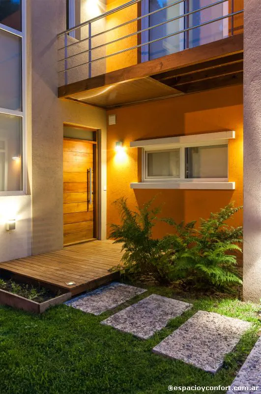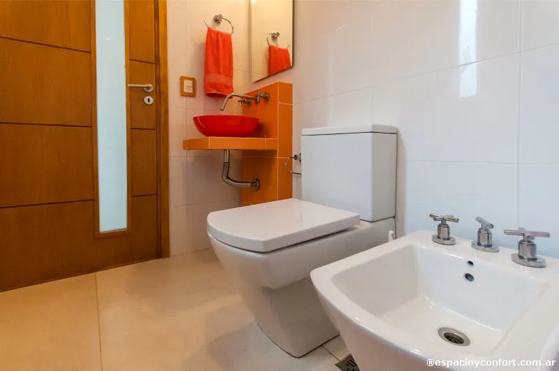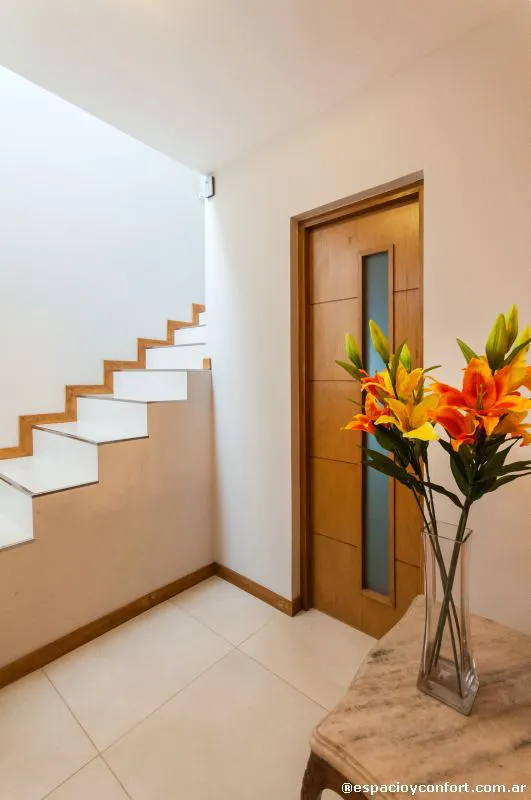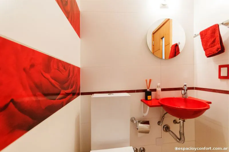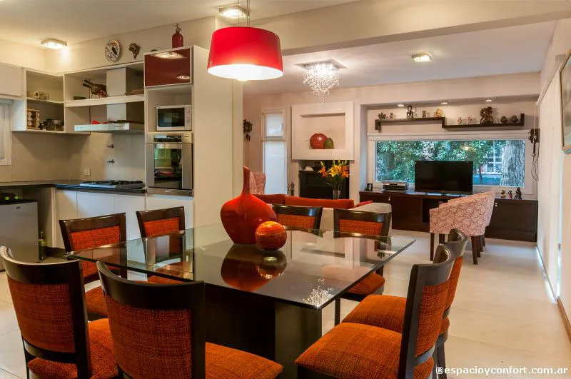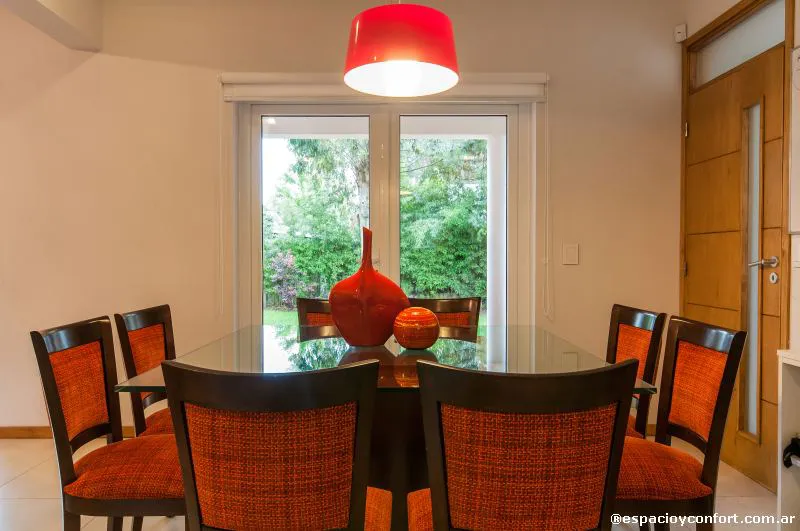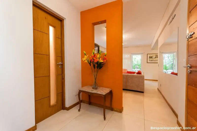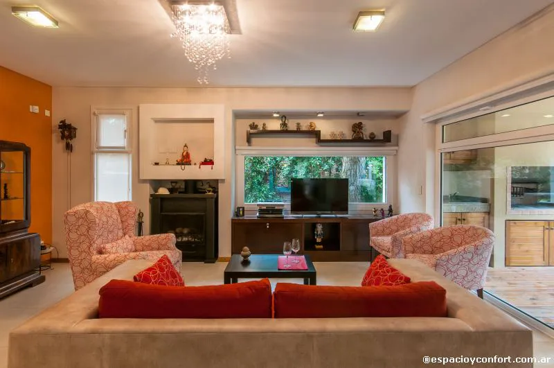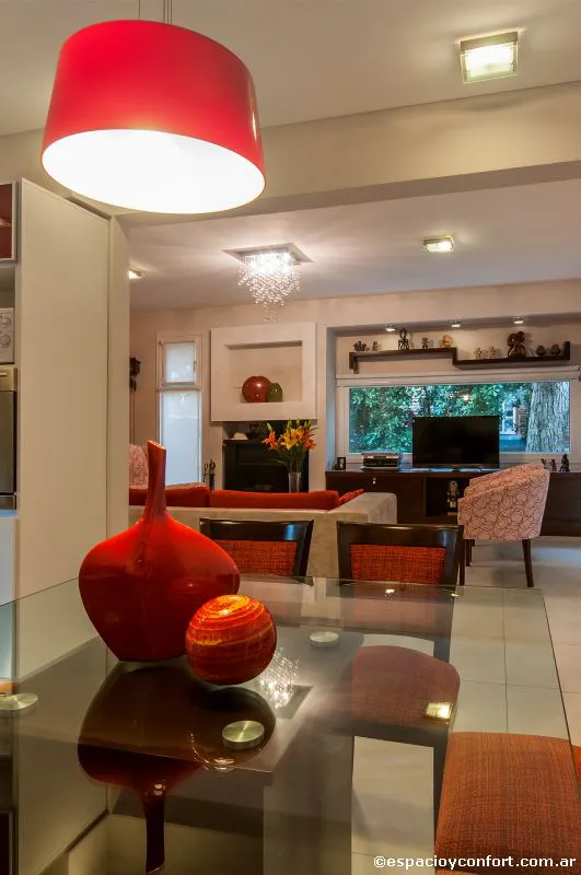 En el espacio público integrado del que hablamos, el área correspondiente al estar ostenta una pared del mismo tono anaranjado que reviste el exterior y que puede verse también en el medio muro que divide el acceso hacia las áreas sociales del que conduce a la escalera que llevará a las privadas del primer piso. Por las enormes puertas-ventanas de vidrio penetra el verde; el resto de las paredes son blancas al igual que el piso. Los colores fuertes persisten con su simbología en los detalles: el rojo en el estampado de los sillones, en algunos almohadones, en la lámpara que pende sobre la mesa del comedor y en la exquisita guarda del toilette cuyo motivo simula pétalos de rosa.