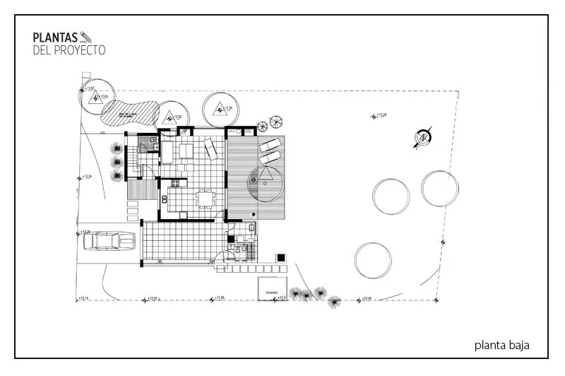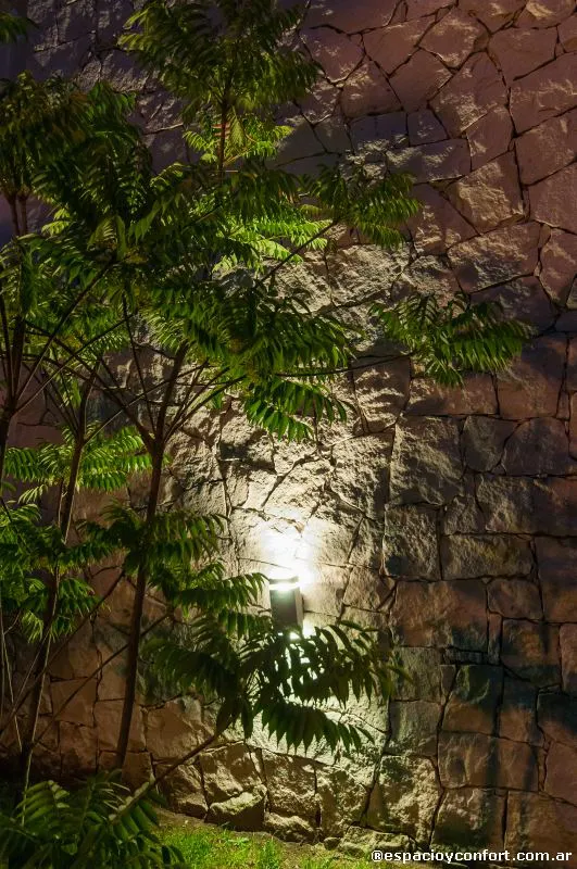 A la izquierda de la entrada principal, un muro de doble altura de piedra blanca enfatiza la cerrazón hacia la calle y crea una continuidad con el parque y, a la derecha, un plano con estucado en tono neutro contiene el salón de usos múltiples y lo integra al tramo del jardín lateral, generando así una prolongación espacial interior-exterior. En este sector del jardín los anhelos de los propietarios se han materializado en la escultura de buda rodeada de piedras, las plantas y el cerco de bambú, ambiente digno del mejor paisajista.