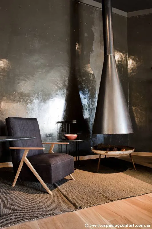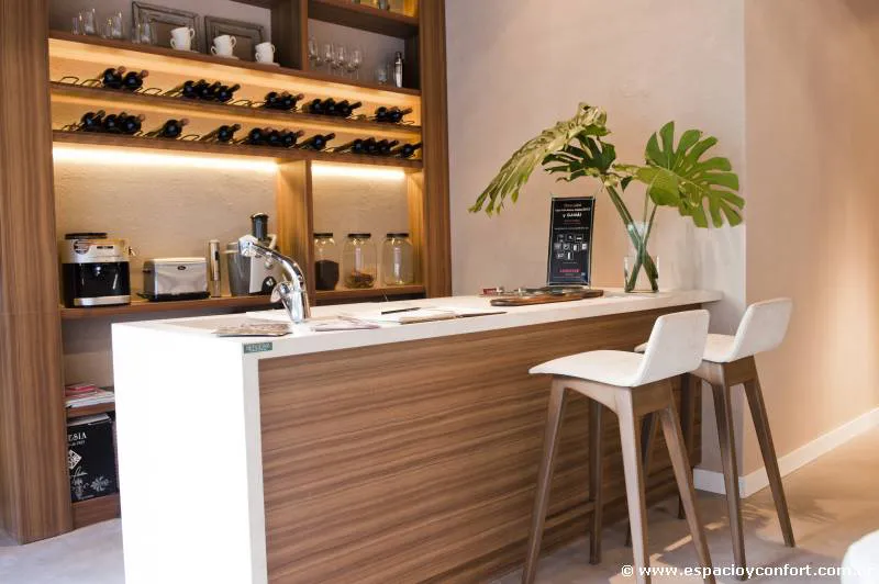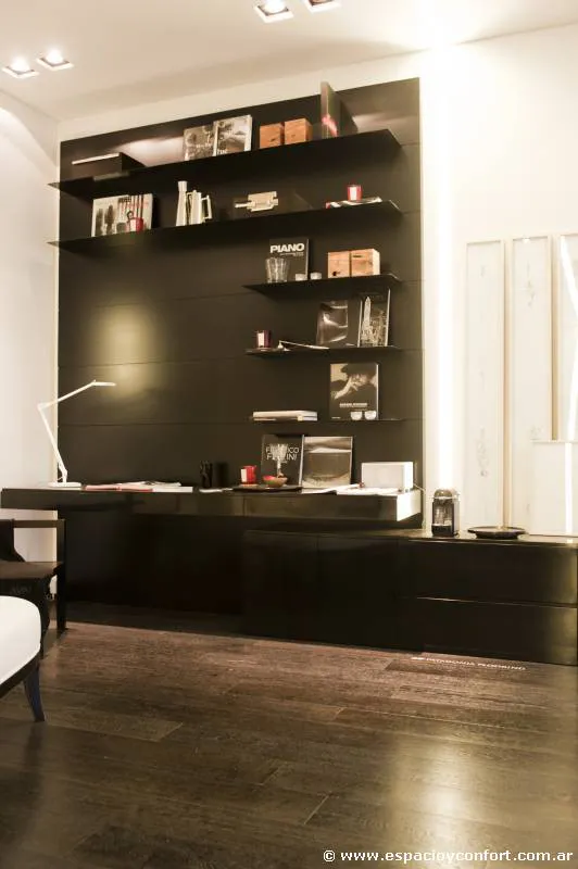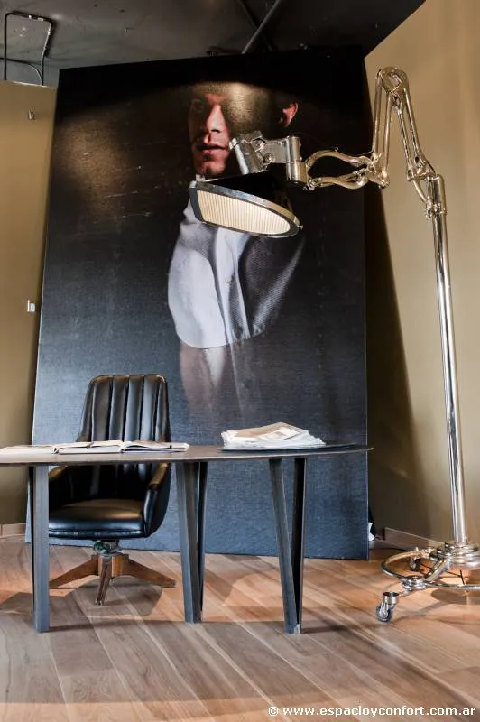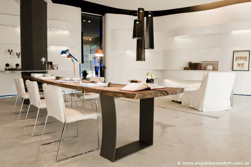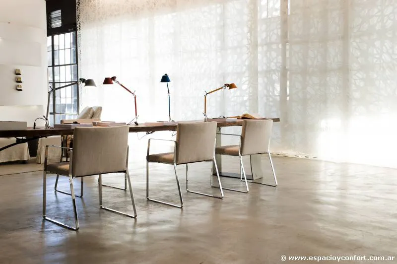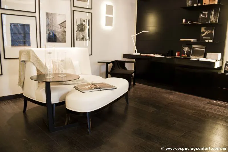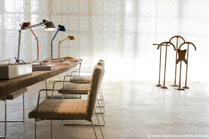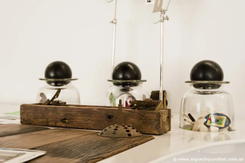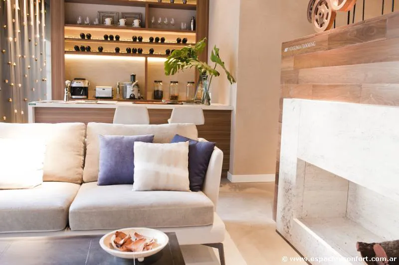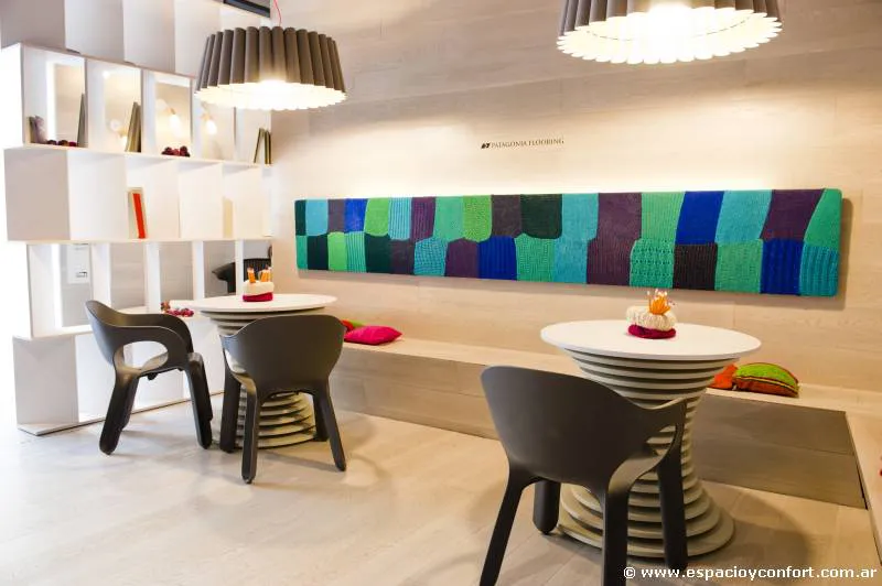 Todo el equipamiento está realizado íntegramente con la línea Touch de melaminas de Masisa en roble americano y negro; la paleta de tonos es simple, madera y negro. El piso de cemento alisado de Bomanite y los centros de mesa en cristal y arte en carbón en colaboración con José Luis Otiñano.•