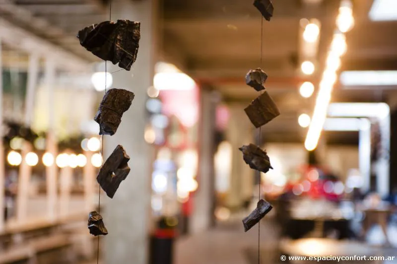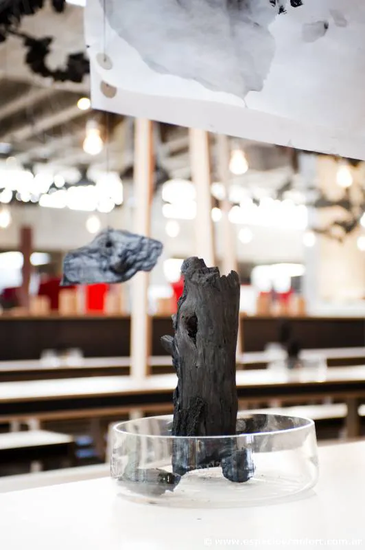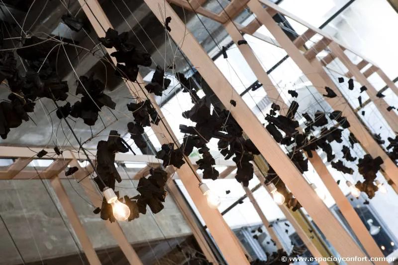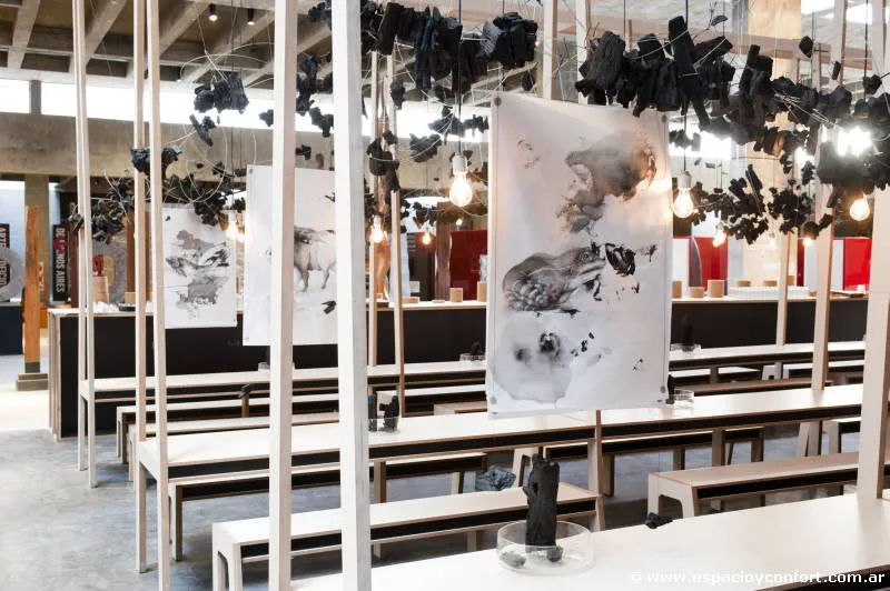 Café Molina. Alpargatas. Un espacio fabril, de grandes mesones y carbón como elemento decorativo. Estos dos elementos caracterizan el espacio, como una recreación moderna de los antiguos comedores de las grandes fábricas de principio de siglo XX. Alpargatas, el edificio que aloja la muestra es un claro ejemplo. Carbón, porque era el combustible elemental por esas épocas, para todo proceso de industrialización. Hoy el carbón, es un elemento sustentable, y con su uso el autor pretende explicitar sobre la connotación distópica del carbón vegetal, provocando la contaminación y la destrucción, al tiempo que se emplea en la purificación de la salud y el agua. Esculturas de carbón y alambre como una expresión de la naturaleza y la libertad. Sustancia negra que purifica la energía, representa la naturaleza que muere pero renace. Los grabados en tinta negra y carbonilla, están realizados por la artista plástica Alicia Esquivel.