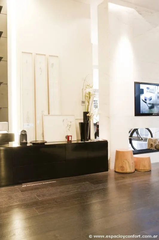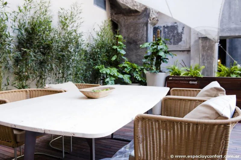 La terraza del loft presenta el mismo clima que el interior. Se proyectó un sector seco revestido con deck de madera Lapacho acompañado de distintas plantas que ayudan armonizar y lograr un espacio vital y acogedor. Está sectorizado por un espacio de estar y relax, y un sector de comer conformado por una mesa de 2x1 m con base de metal y tapa de mármol Travertino Navona y sillas, con sillones de diseño contemporáneo confeccionados especialmente para este espacio. Se realizó un proyecto de iluminación que destaca los diferentes elementos del espacio creando el clima buscado.•