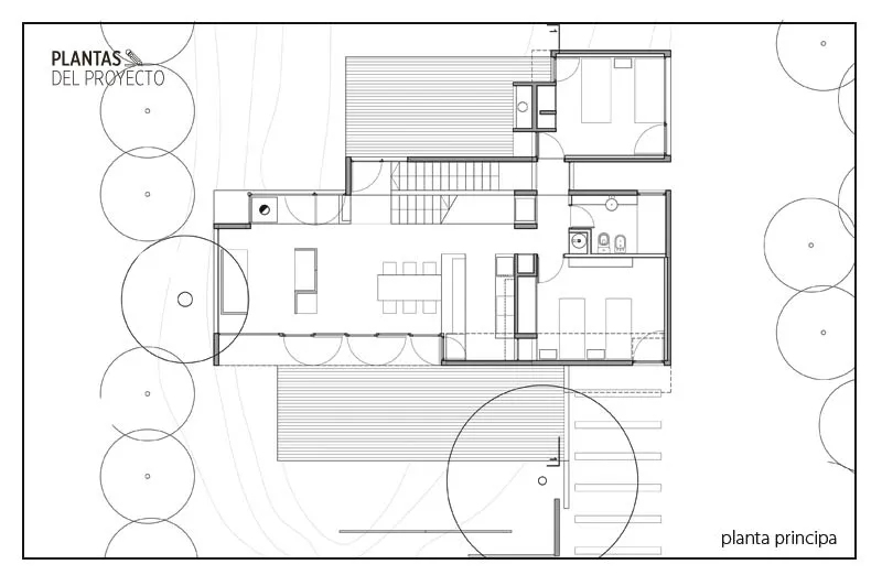 El terreno de 950 m² se encuentra a escasos metros del médano que pone límite a la playa y presenta en el centro y en toda su longitud una elevación tipo cresta de alrededor de 3metros. Lo único que obstruye parte de las bellas vistas es, de un lado, otra casa de gran tamaño. La particularidad del terreno y la condición puesta por los clientes -un matrimonio joven con tres hijos pequeños y una intensa vida social- a saber, que los ambientes principales de la casa y sus expansiones tuvieran vista al mar, determinaron en gran medida el proyecto. Otros aspectos determinantes fueron optimizar la aislación térmica (facilitada en las casas anteriores por los árboles) en un lugar que se hallaba por definición sometido a la intensidad de los rayos del sol. De ahí que los techos sean expansiones de diferentes ambientes; vistosos decks de madera apoyados sobre losas que, además de permitir el disfrute de actividades al aire libre, funcionan como sombrillas. En el mismo sentido, para controlar el encandilamiento producido por el reflejo en la arena, se evitaron las clásicas aberturas de piso a techo, y a las existentes se las protegió con aleros y se determinó su tamaño y posición en relación con el barrido del sol y los vientos.