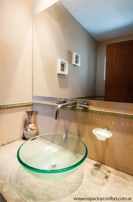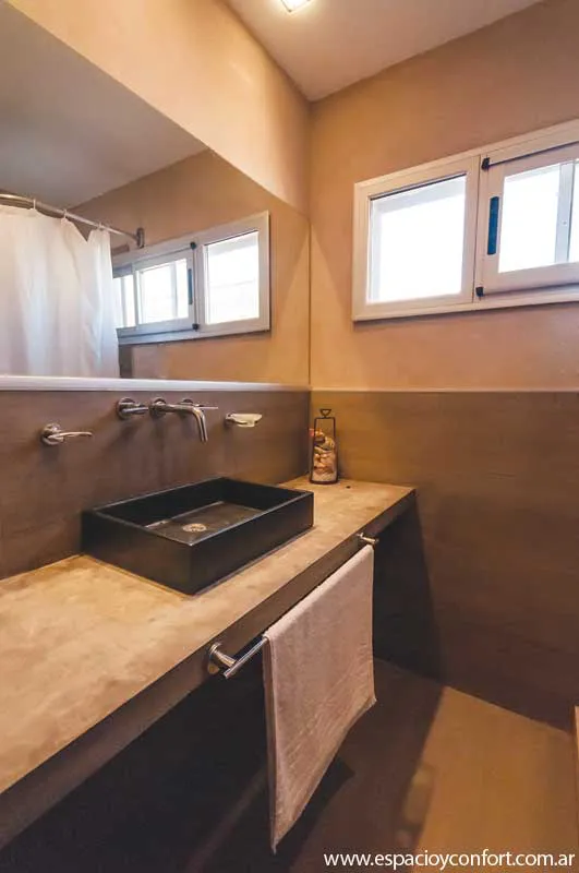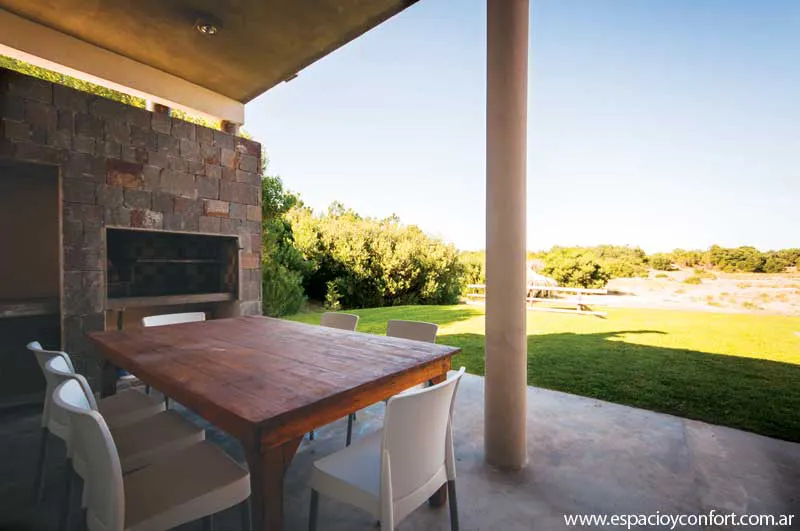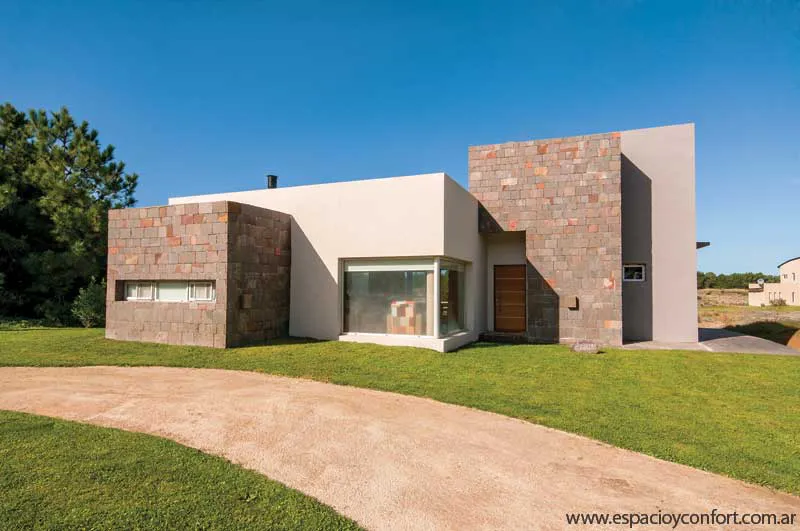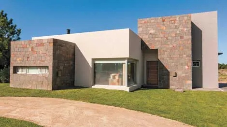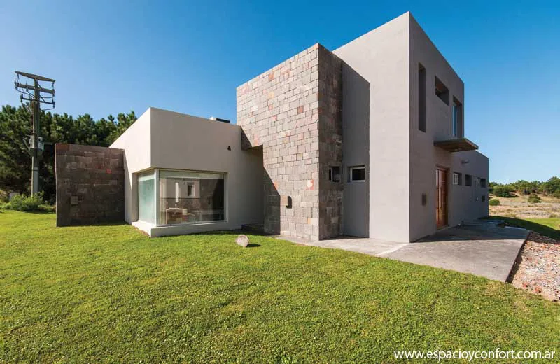 A esta disposición de los ambientes cómoda, funcional y bien ordenada, corresponde una fachada de hormigón y piedra (por supuesto) de la zona que, además de favorecer el cometido de mímesis con el entorno, destaca los volúmenes netos de la vivienda. Como el confort fue otra de las premisas irrecusables del proyecto, los ventanales, que posibilitan el disfrute de la luz solar al máximo, obedecen a una carpintería de aluminio anodizado natural cuyo doble vidriado ofrece aislación térmica y seguridad. En aras del mismo confort y muy de acuerdo con la limpieza que requieren las casas de playa, los pisos son todos de porcelanato.
