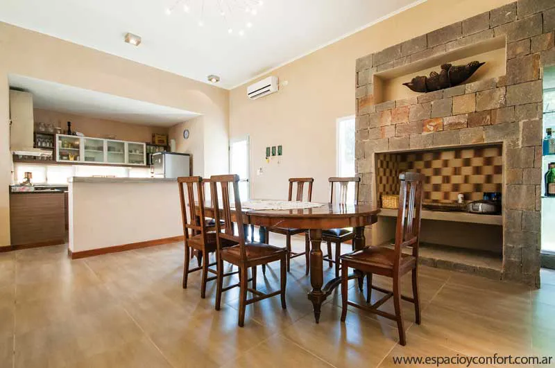 En cuanto a la decoración, conjuga la rara cualidad de hallarse a caballo entre lo ecléctico y lo rústico. Esto se pone en evidencia, sobre todo, en el juego que se produce entre los dos estilos de sillones y mesas ratonas dentro del living: de un lado los coloridos patchwork, enfrente los netamente rústicos, en medio, equilibrando, un liso sillón de cuerina. El juego de comedor es de estilo, cita de la antigua mesa de reunión familiar. La cocina, en cambio, apunta a lo moderno mediante un amoblamiento en melamina con terminación de aluminio y una protagónica mesada en granito negro Brasil. Las habitaciones recuerdan las de una casa de campo y lo mismo podría decirse de los muebles de exterior, mientras que el baño refleja en su superficie espejada la estética moderna de la cocina.