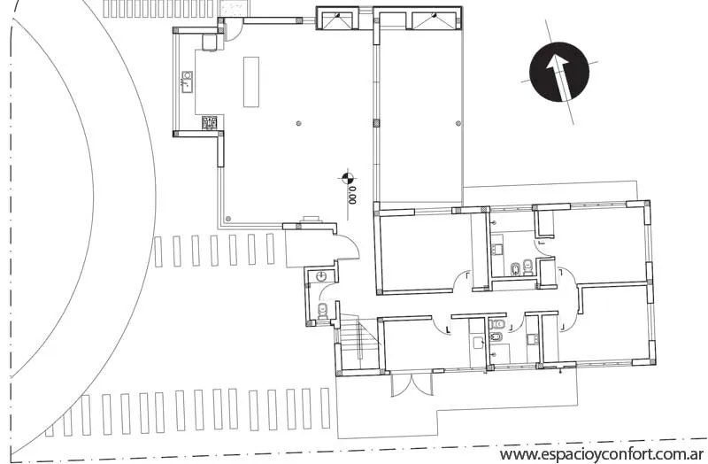Se trata de una casa en dos plantas con una distribución en ele bien marcada. Al frente se dispone la zona más pública compuesta por un living comedor integrado y una cocina que suma su amplitud al área, de la cual tan sólo la divide una oportuna barra-desayunador; la otra ala alberga los dormitorios entre los que se cuenta una habitación de servicio con baño. En el exterior se localiza el sector de galería cubierta con parrilla y, en la parte trasera de la casa, un garaje que, aprovechando las asimetrías medanosas del terreno, es subterráneo.