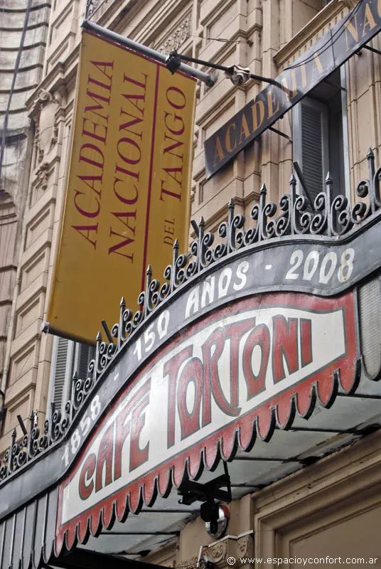 En 1894 fue inaugurada la Avenida de Mayo concebida por Don Torcuato de Alvear, que desde entonces, constituye el Eje Cívico de la Ciudad de Buenos Aires, uniendo la Casa Rosada con el Congreso de la Nación. Entre los edificios históricos y bares notables, la avenida alberga, al 825, al legendario e histórico Café Tortoni. El café abrió sus puertas por el año 1858, obra de un inmigrante francés de apellido Touan, emplazándolo en la intersección de las calles Rivadavia y Esmeralda. El nombre fue tomado de un establecimiento ubicado en Boulevard des Italiens, el cual era frecuentado por la elite de la cultura parisina del siglo XIX. Si bien existen ciertas dudas sobre esta posible versión del origen del nombre y su fundador, en la novela Rojo y Negro de 1830 del francés Henri M. Beyle, se hace referencia a la existencia de un café Tortoni en París, lo que le otorga veracidad.