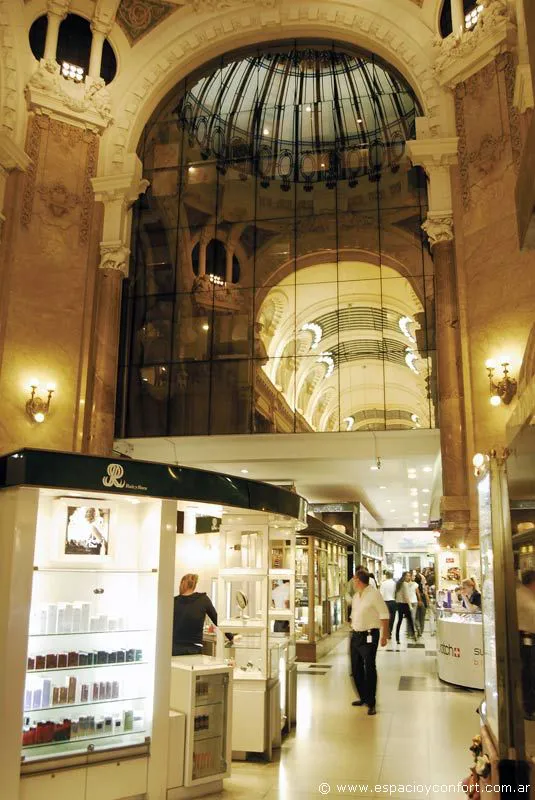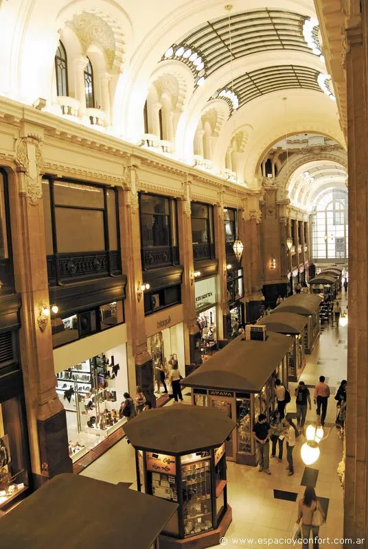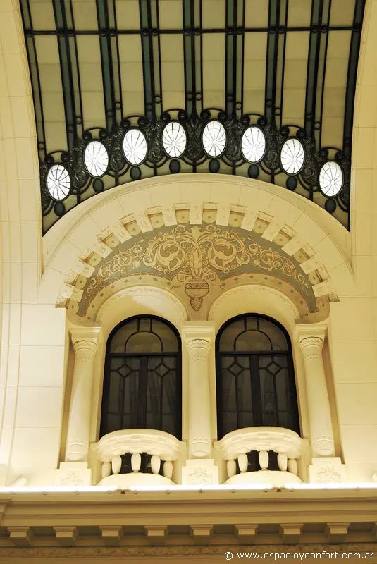 El cielorraso del pasaje fue decorado y adornado por obras de Pinnel e interrumpido por vidrios opalinos sobre armazones de hierro forjado. A ambos lados del pasaje, encuadrados por grandes pilastras y columnas de mármol, se presentan los comercios en la planta baja con amplias vidrieras. En tanto, el segundo piso, cuenta con ventanales de los antiguos escritorios, coronados con bíforas, ventanas formadas por dos vanos duplicados y arcos de medio punto, materializando un efecto estético señorial.