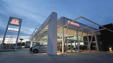 Las instalaciones nuclean tres empresas pertenecientes al Grupo Simone; se trata de Ford Camiones, Ford Autos y Toyota. El proyecto, dirigido por los arquitectos Horacio Alcuaz y Sol Alcuaz, y ejecutado por Solana SRL Construcciones, se llevó adelante con la premisa de mantener bien definidas las particularidades y la identidad de cada firma, al tiempo que se logró corporizar la presencia del conjunto como un mismo grupo empresarial, proporcionándole una entidad común. En este sentido, la lectura de cada concesionario debía ser en forma individual pero manteniendo un equilibrio con las otras dos áreas.Para materializar estas premisas, se trabajó con el concepto de edificio de perímetro libre, que brinda una gran presencia edilicia retirada de todas las calles y una amplia movilidad interior tanto para los autos como los camiones que se encuentran a la vista del público. De esta manera, se dispuso el frente de la locación para la exhibición, mientras las operaciones de servicios o la reserva de stock comercial se desarrolla en el contrafrente.