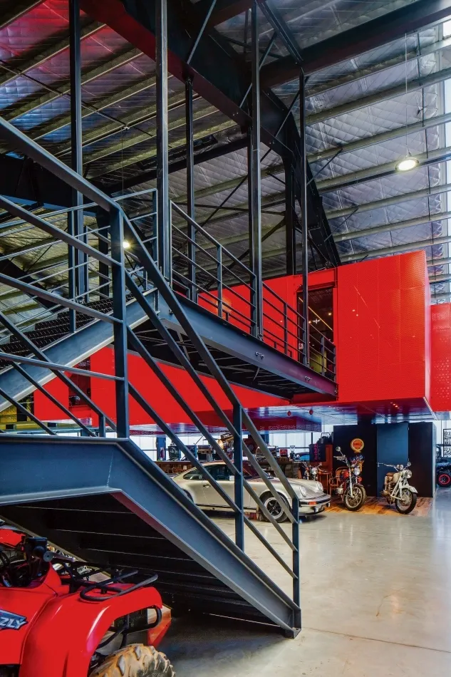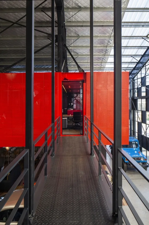 Dentro del mismo volumen colgante se encuentran las oficinas que miran panorámicamente el espacio, filtrado por su revestimiento microperforado rojo que tamizan las visuales y generan un juego de luz y sombra seductor.