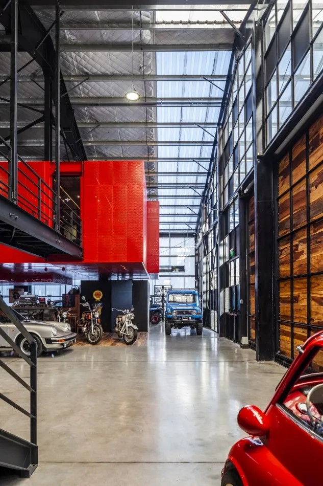 Una serie de pórticos de perfiles metálicos, marcan el ritmo del espacio principal, dan armonía y contienen al protagonista espacial: La caja roja. Gran volumen que parece flotar, que da pelea a la gravedad, que no interfiere en espacio cero. Íntegramente colgada de la estructura de la nave, genera un espacio contenido bajo su forma, creando el lugar de encuentro protegido en la gran escala.