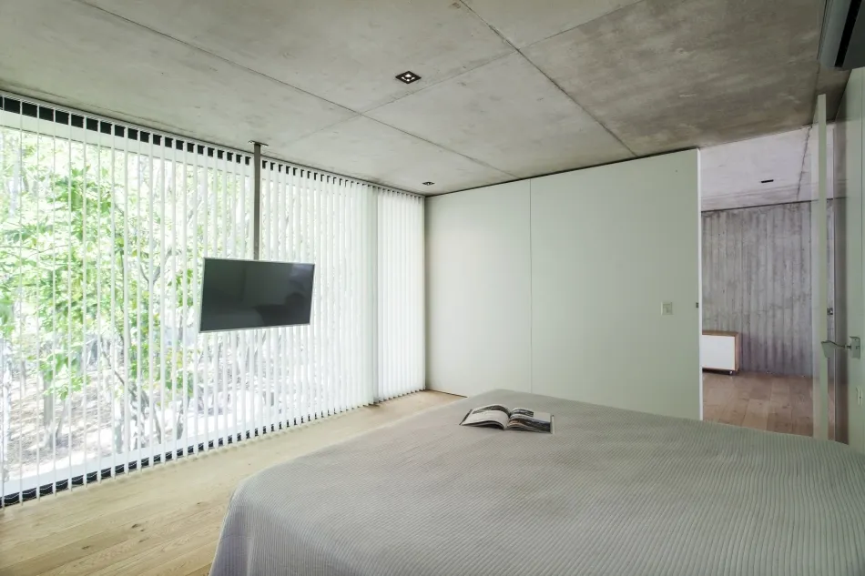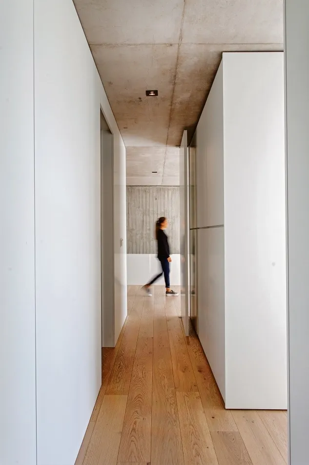 La conformación morfológica de la vivienda está dada por un gran prisma de hormigón visto de 13 m x 13 m, suspendido en el aire que contiene las áreas privadas de la casa. Para delimitar internamente las diferentes áreas se utilizaron paneles móviles y flexibles que generan módulos de guardado, creando así una planta flexible y adaptable a las necesidades de cada etapa.