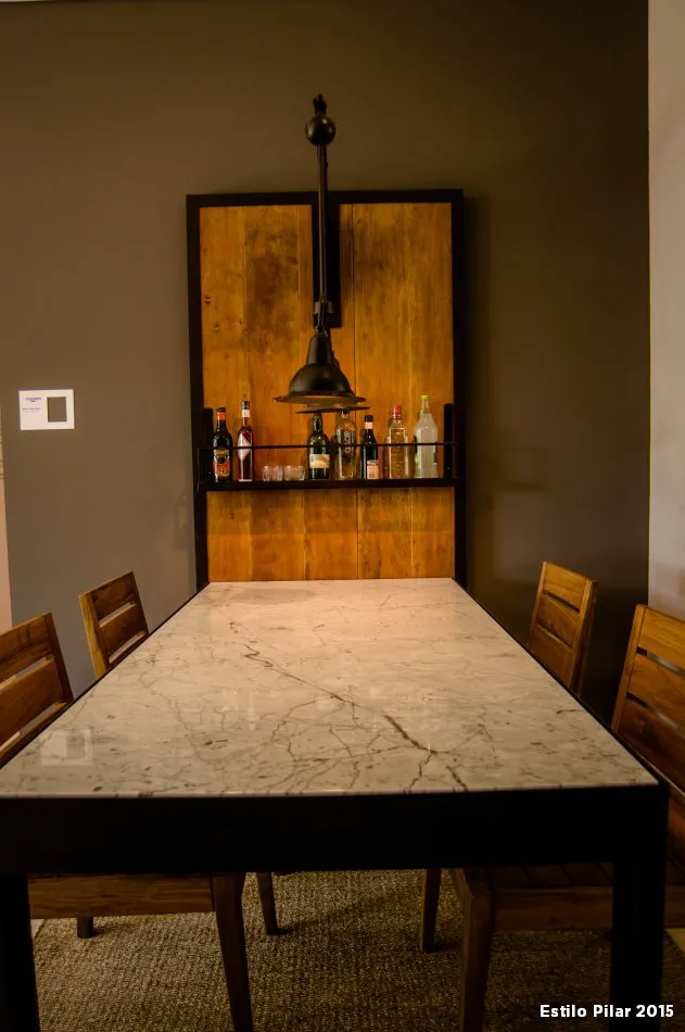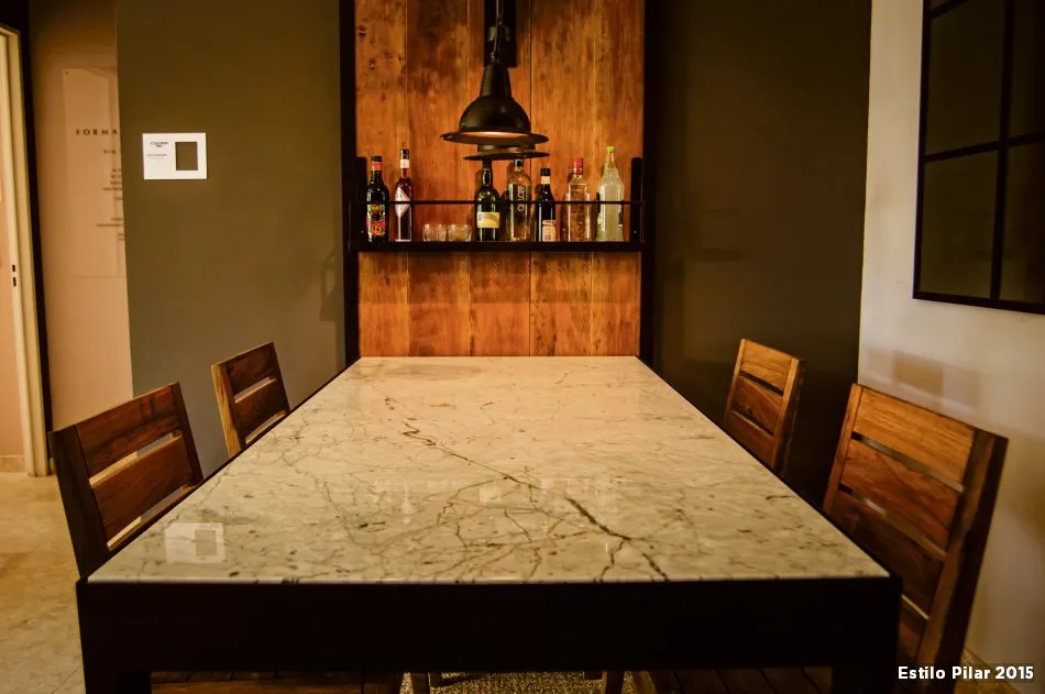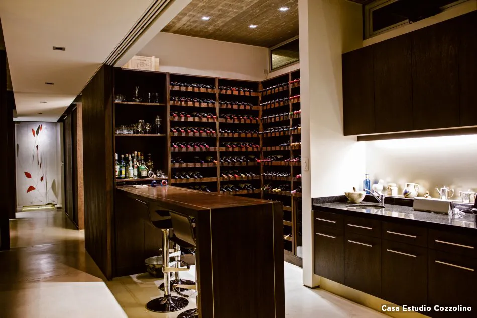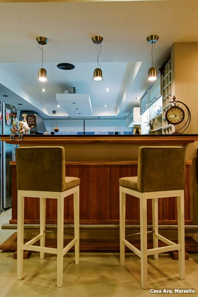 Una opción distinta es colocar el área de bebidas cerca de la cocina, en ocasiones porque es complicado disponer de dos piletas en la casa (necesarios para lavar o enjuagar las copas, verter los hielos, etc.). Lo ideal es contar con una, ya que de este modo se comparten ambas zonas. En estos casos, además, suele incorporarse una barra en la cocina que hace de separador de espacios y a la vez funciona como barra de bar.