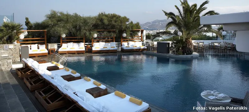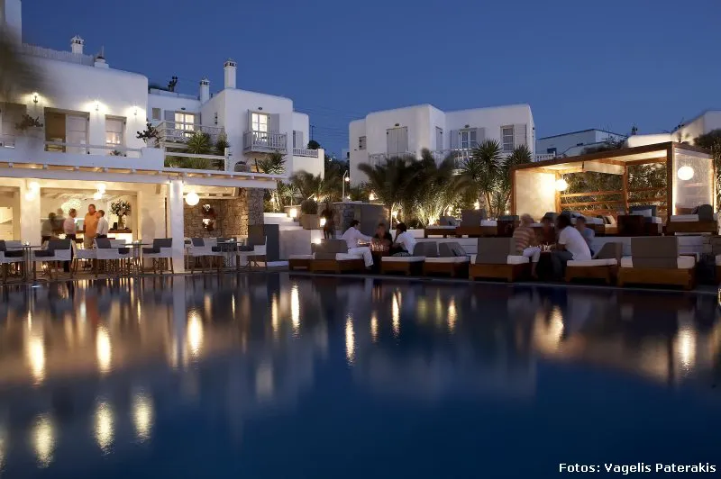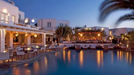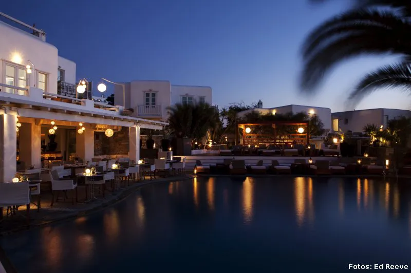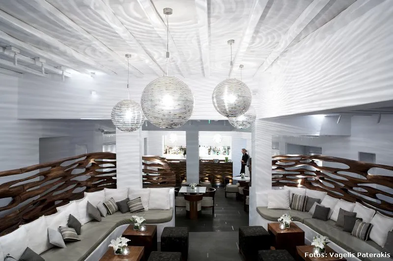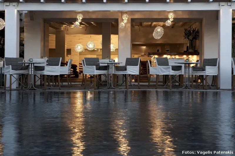 En esta remodelación, las 7 estructuras contemporáneas adicionales que se han añadido recientemente, imitan las casas de Mykonos y se congregan alrededor de una piscina asimétrica, pieza central del hotel. Una de las innovaciones más importantes fue el bar, convertido en un espacio de tres niveles que se derrama en el área de la piscina rediseñada en su nivel más bajo; además de brillantes luces colgantes y materiales naturales inspirados en el mar, que realzan la belleza del restaurante.