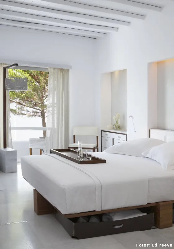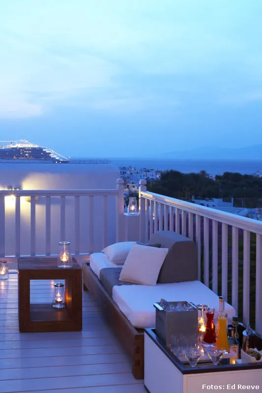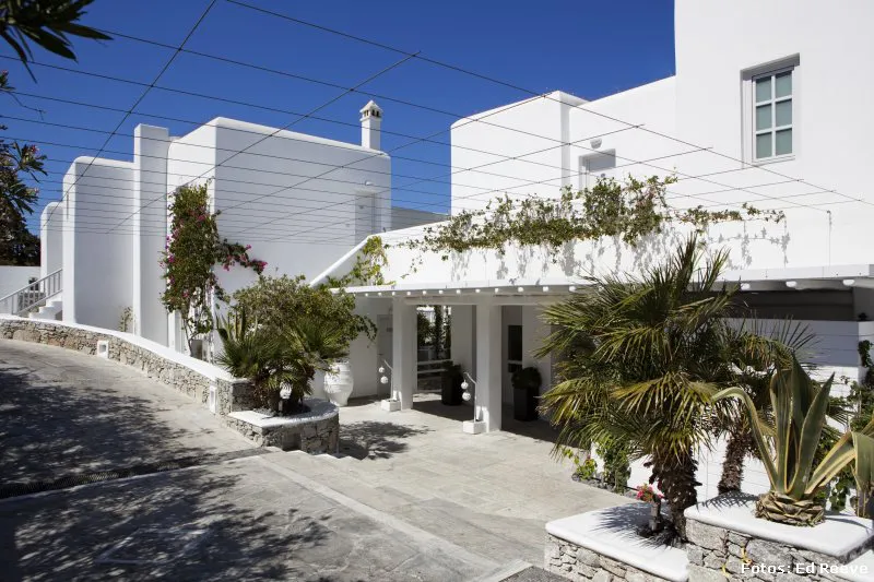 Antigua y sorprendentemente bella, Mykonos, mantiene intacta su esencia, sus rocas, sus colores blancos y azules, sus jardines de cipreses y buganvillas, pero aun así –como todo centro turístico- ha sabido cuándo remodelar y aggiornar sus hoteles.