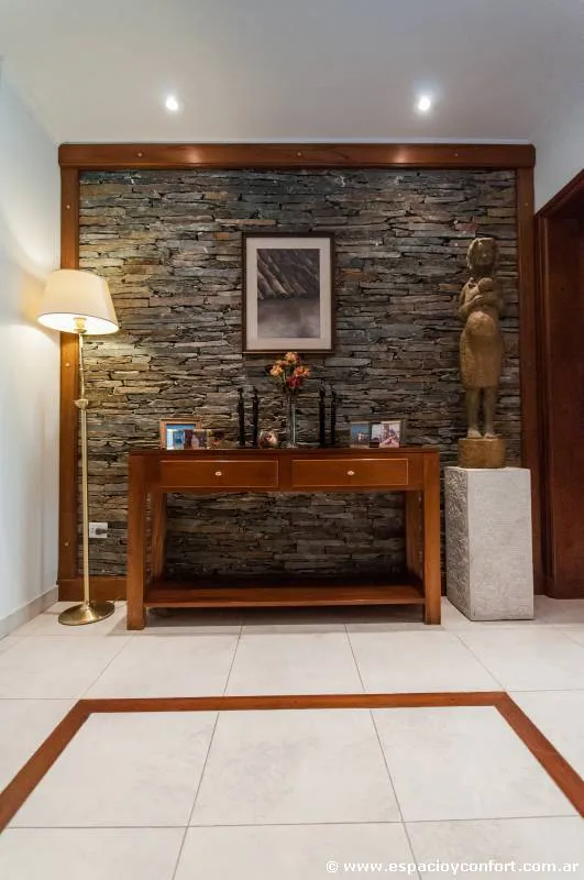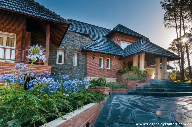 En este caso, la fachada de ladrillos a la vista, con sus chimeneas y los empinados techos de tejas francesas negras esmaltadas, las aberturas revestidas en blanco y las puertas de madera, aluden, sin embargo, al estilo inglés, mientras que los detalles de revestimientos en piedra listón natural (que se pueden encontrar tanto en el exterior como en el interior de la casa) le dan un toque personal y abiertamente moderno.