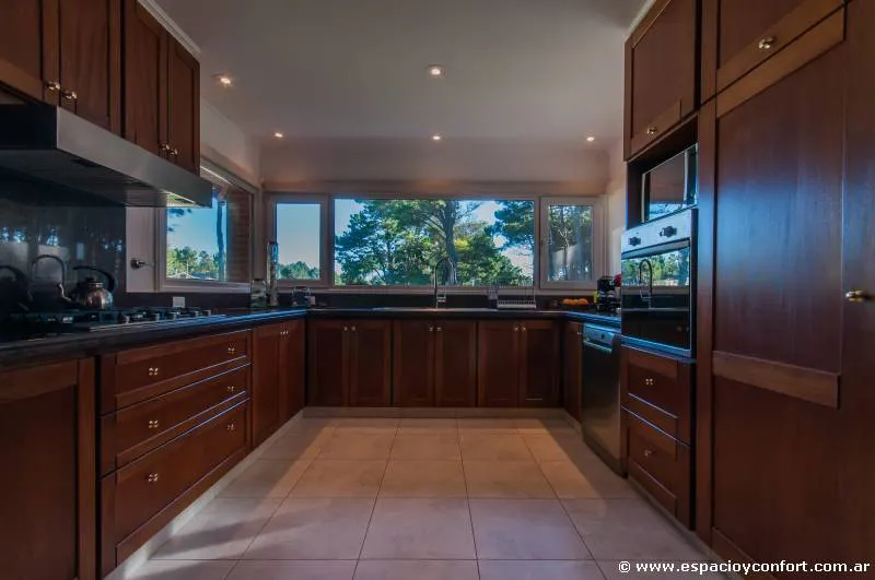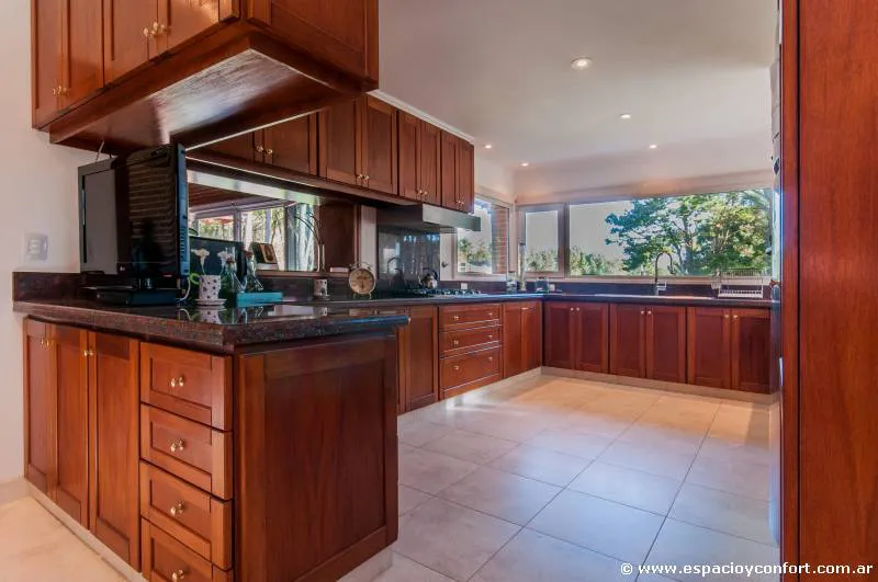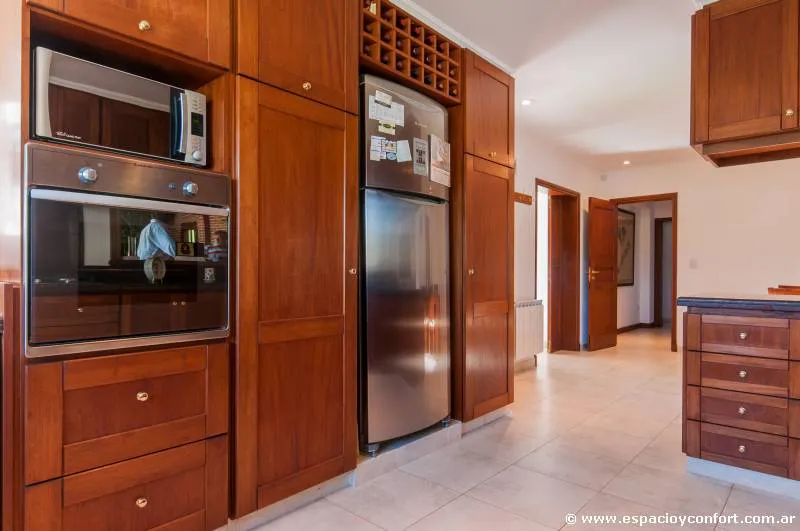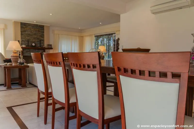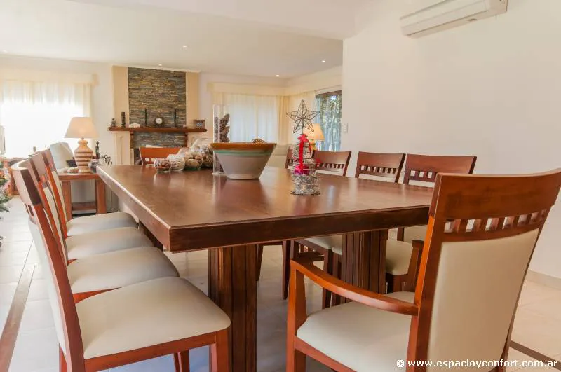 La cocina y el comedor diario forman un único y espacioso ambiente indiviso en el que prima la madera. En el área destinada a preparar los alimentos, el mobiliario se ha confeccionado a medida en cedro. Por lo demás, las mesadas son de granito y la calidez del cedro sólo es interrumpida por los electrodomésticos de acero inoxidable. También el juego de mesas y sillas es de madera, al igual que en el comedor principal que, por su parte, compone una sola área con el estar.