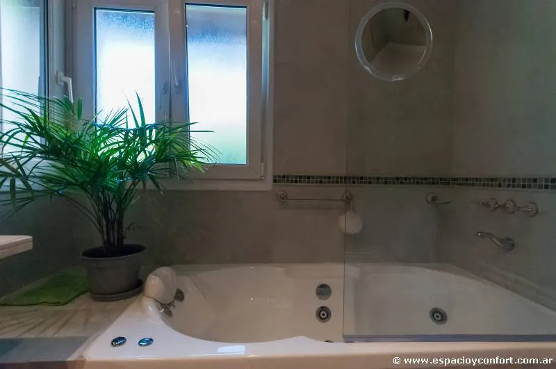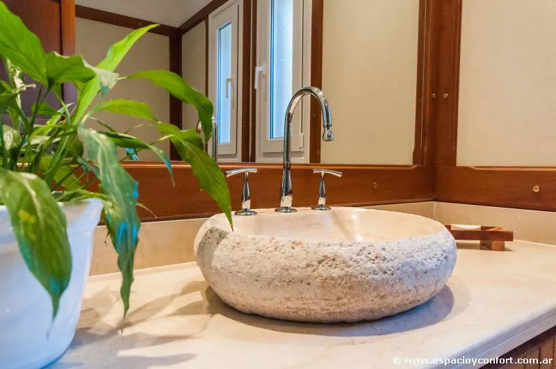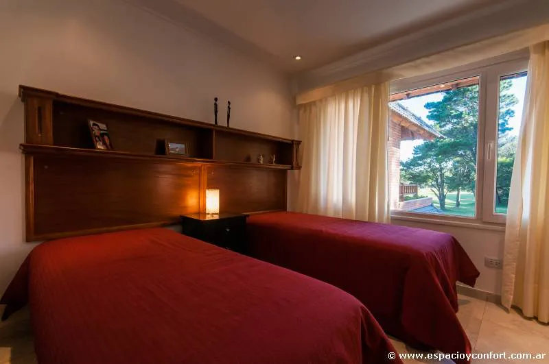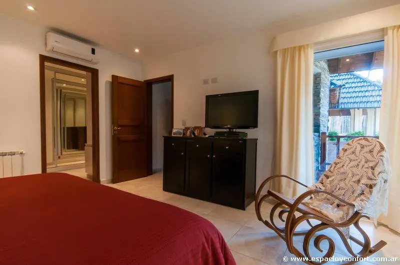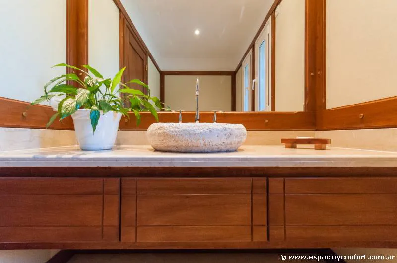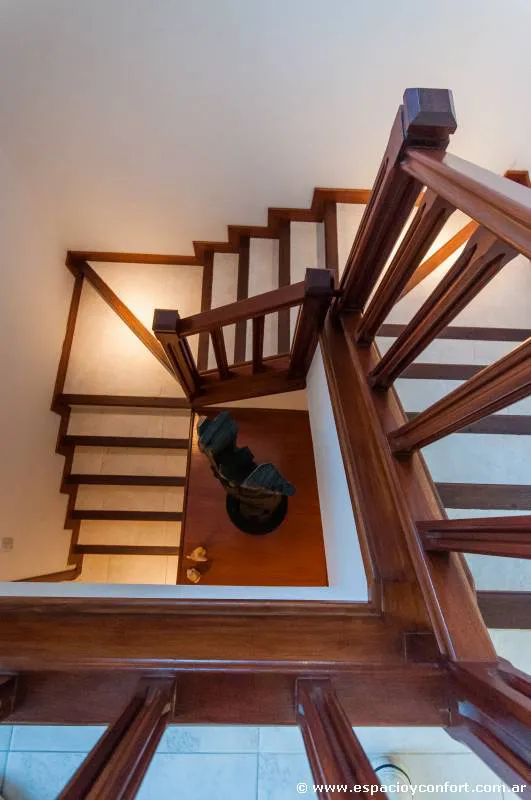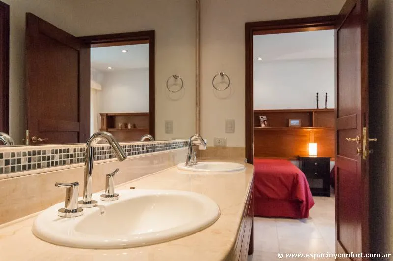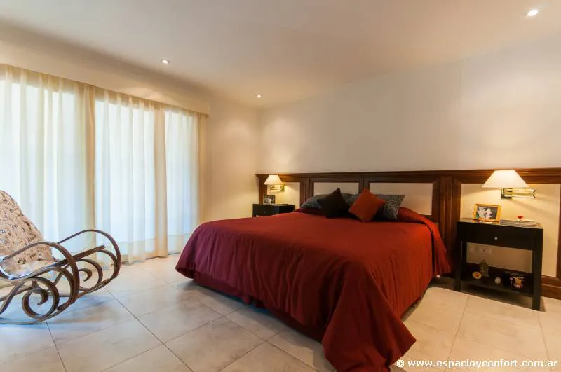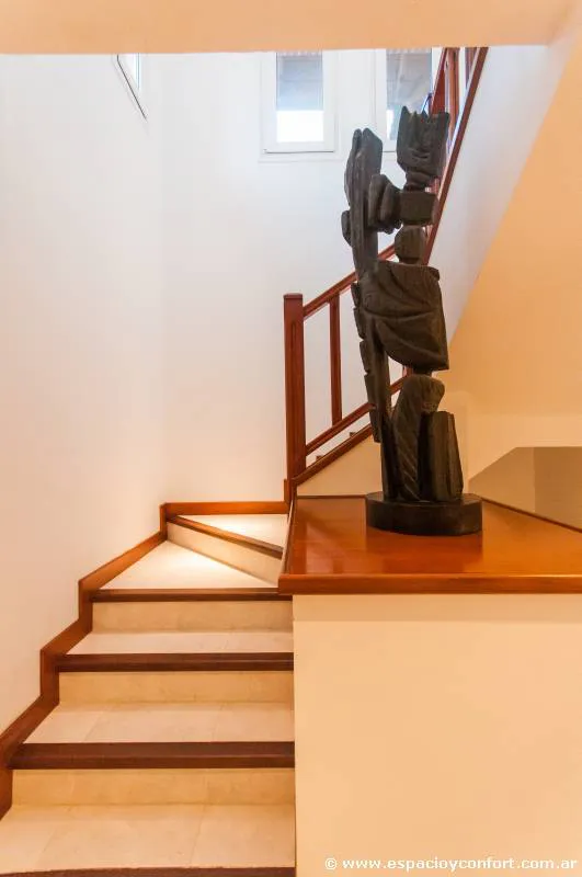 Enlaza con el nivel superior una escalera revestida en porcelanato con listones y baranda de madera. Allí se encuentran las habitaciones en suite que, al igual que la suite principal de la planta baja, desprenden un aire tranquilo de lujosa austeridad sin ostentar el confort supremo que sus comodidades prodigarán a quienes duerman en ellas. Los baños vuelven a la madera y a los revestimientos cerámicos con guardas.