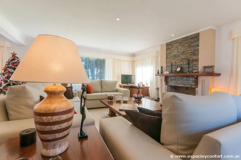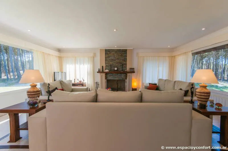 En el estar, el hogar revestido en piedra se erige en protagonista de la escena. Alrededor de él se distribuyen cómodos sillones de líneas clásicas. La paleta del blanco domina en ellos, en los pisos de porcelanato y en las cortinas que adornan los considerables ventanales. Para no interrumpir las vistas al campo, la iluminación artificial se resolvió con spots. Toda la decoración está complementada por carpinterías a medida, mesas, aparadores y otros detalles, todo en madera de la mejor.