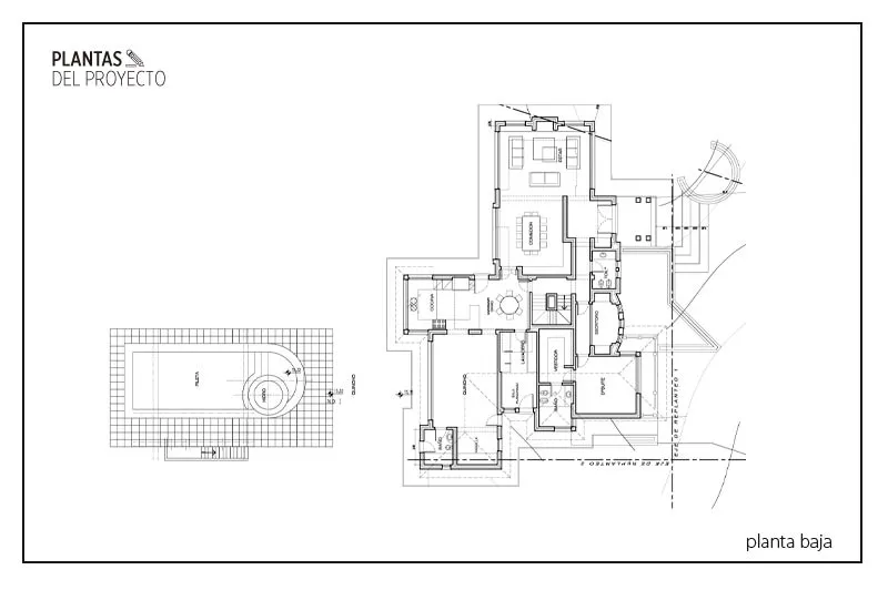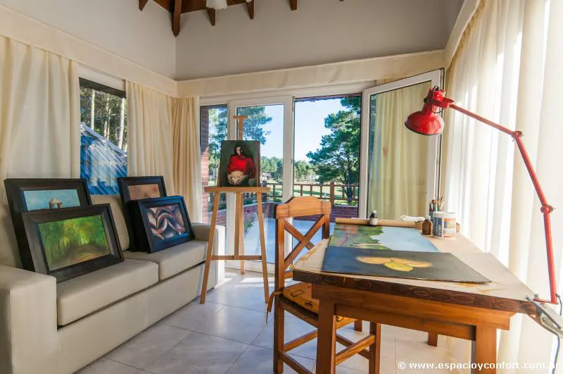 La vivienda se desarrolla en tres niveles. El primero es subterráneo y comprende un amplio garaje, habitaciones de servicio y un depósito; en la planta baja se extienden la cocina y el comedor diario, un quincho realmente imponente con parrilla y baño, el comedor principal y el estar, la suite principal, un escritorio y un lavadero y, por supuesto, la pileta; por último, en la planta alta, encontramos dos dormitorios en suite y un atelier con terraza (concretización del sueño de la dueña, que es artista plástica).
