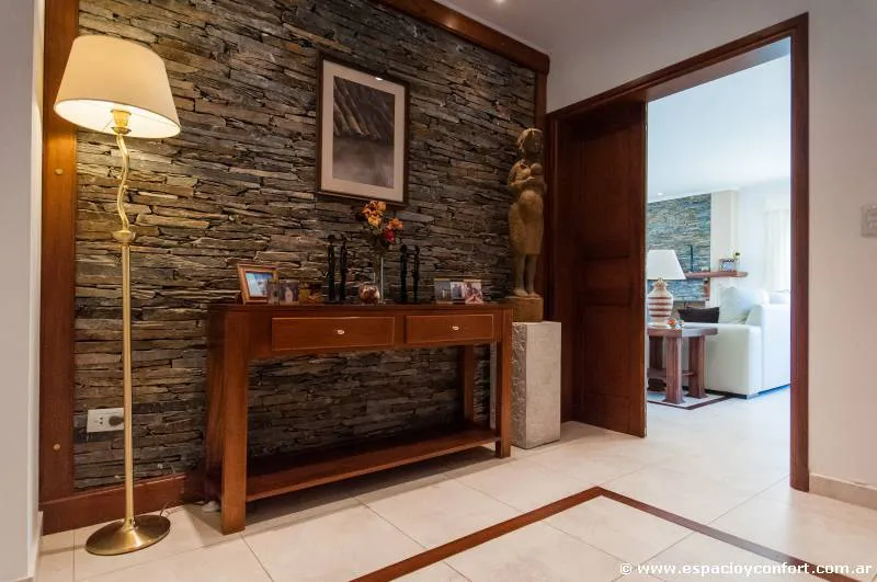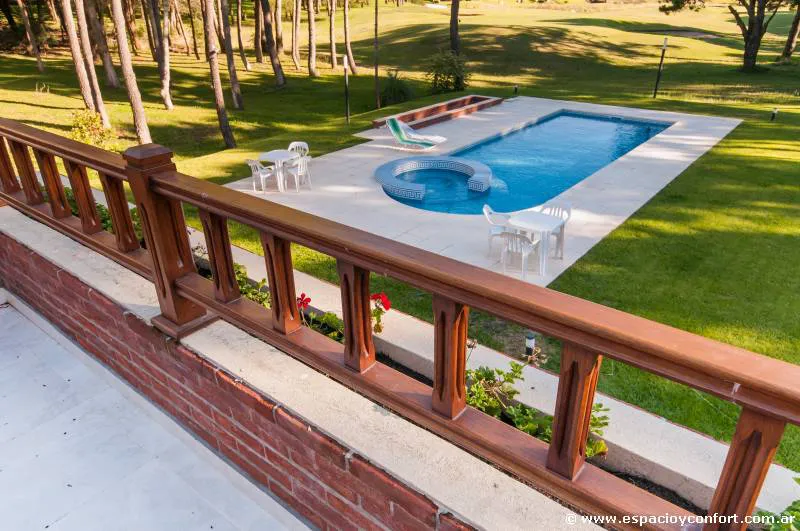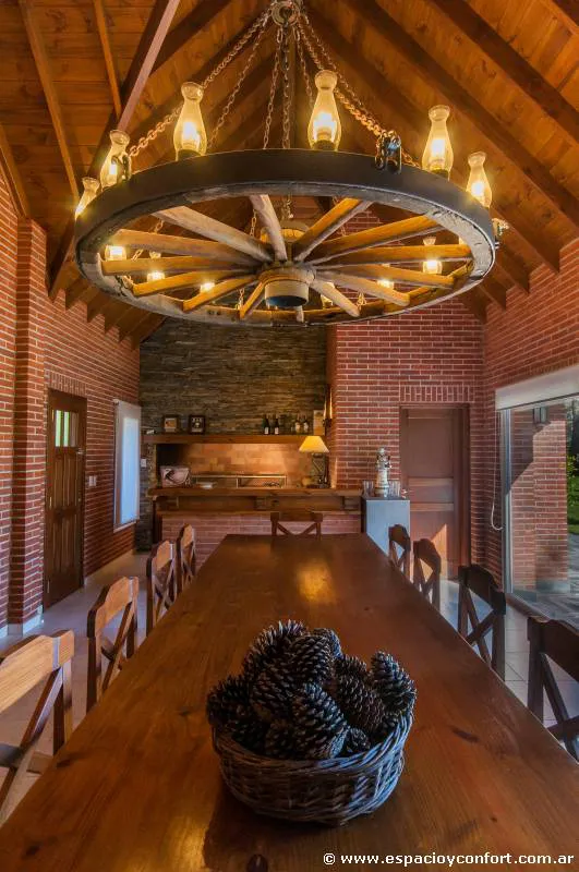 El quincho es un recinto privilegiado, no sólo por su tamaño, sino porque su aire decididamente rústico empalma a las mil maravillas con su función: allí se hace el asado para toda la familia y los amigos. La rueda de carro a modo de lámpara es un hallazgo que rememora la que pendía de los antiguos cascos de estancia. Los techos, la barra que enmarca la parrilla, la mesa y las sillas son, de nuevo, de madera. Devolviéndonos a nuestro siglo, por las puertas ventanas de cristal, se cuela la moderna pileta y el verde césped bien cuidado.