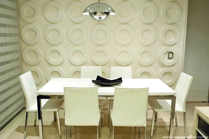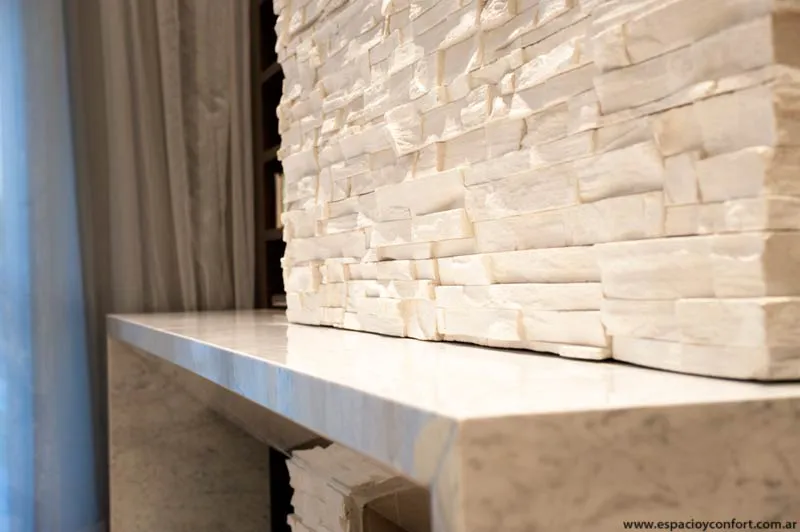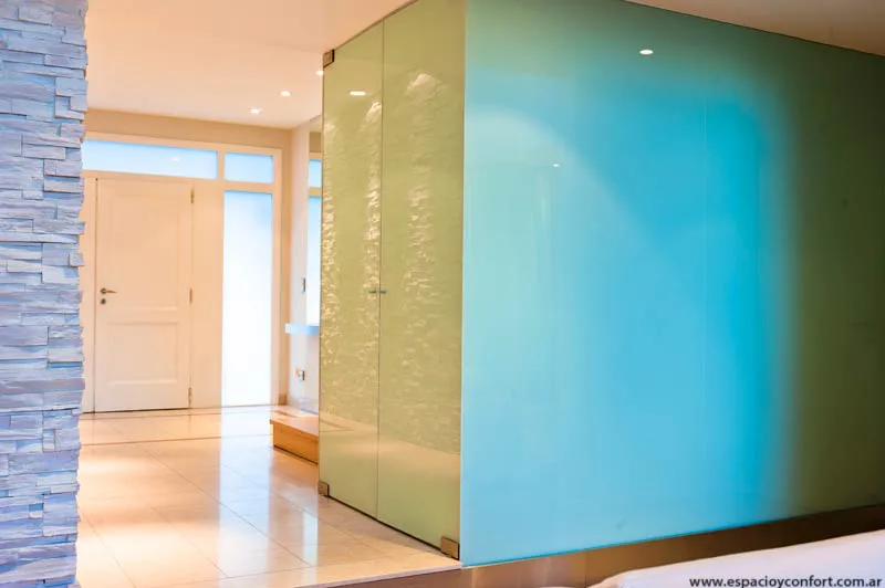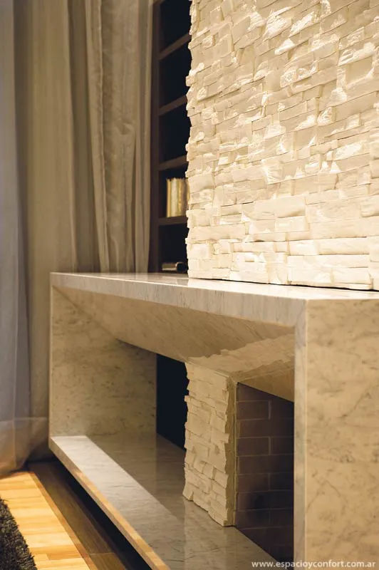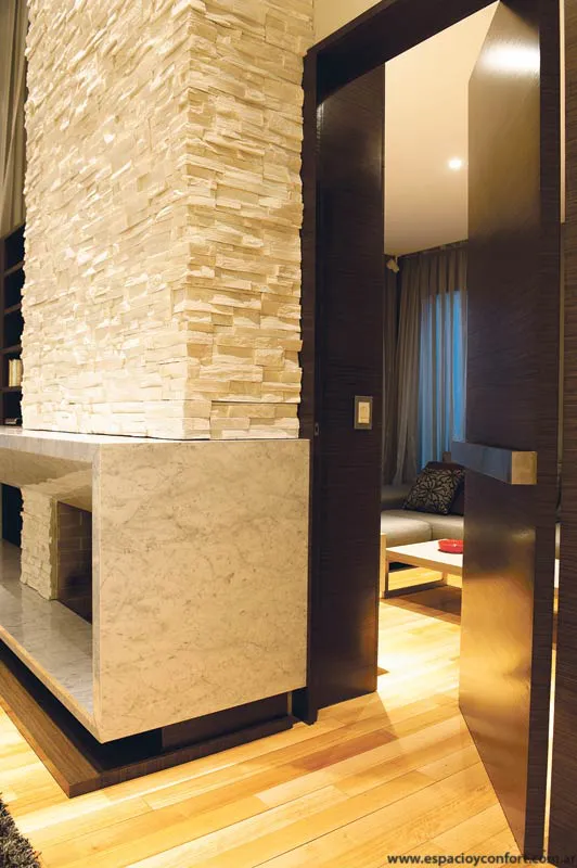 Ni bien el visitante ingresa al recibidor, se sorprende con una espacialidad reforzada por los distintos tipos de blanco cuyas posibilidades se abren como un abanico en función de las texturas: la del porcelanato del piso, la de las paredes que alternan su lisura con la rugosidad de la piedra y, como protagonista, la de la piel de vidrio lechoso que envuelve la caja de escalera y que abstrae al guardarropa interior.