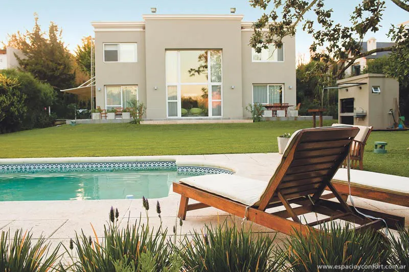 El retiro de la vivienda respecto de la línea municipal no hace sino acentuar su aspecto señorial, reforzado por el adoquinado que ennoblece con su antigüedad el cuidado jardín delantero que se extiende hacia atrás, dando lugar a un espacioso parque con piscina. Un aire francés la circunda sin que se pueda atribuir con precisión a un único detalle (ni mansardas ni piedra de París), sino que parece emanar del conjunto, sobrio y elegante.