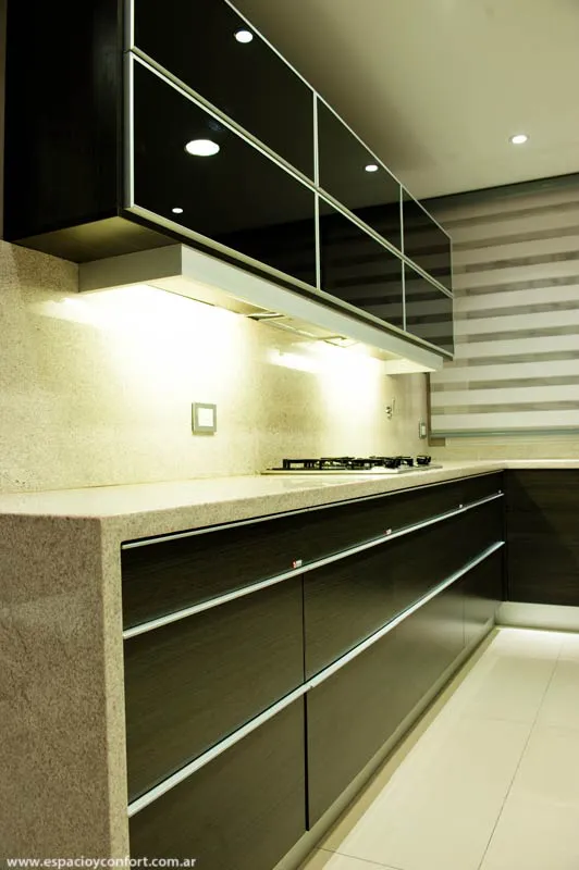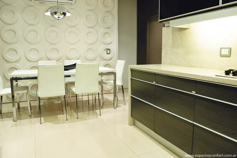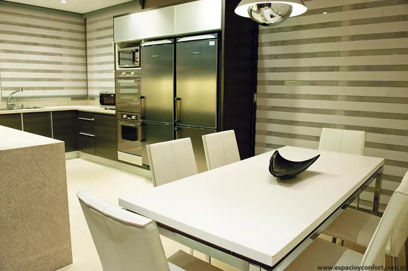 Para terminar con la planta baja, habría que decir que la cocina también respeta con la mesada y pisos de igual color el concepto de membrana al cual se le incorpora el mobiliario oscuro y el muro de anillos blancos.