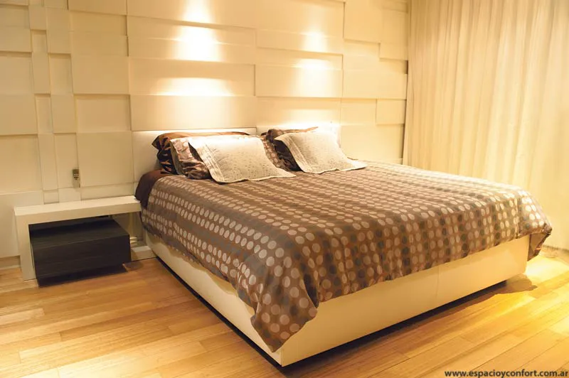 En la planta alta, sorprende la elegancia de la suite conseguida sin ornamento alguno, tan sólo la pared de relieves rectangulares de la que la cama (con sus extensiones laterales que ofician de juego de noche) parece ser una proyección.