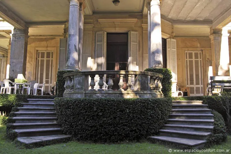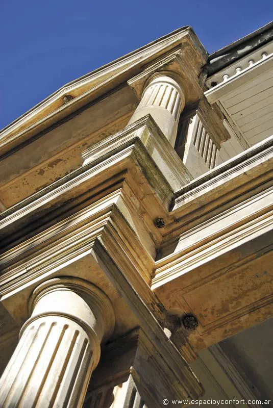 La vivienda se presenta como un edificio tetrástilo, al exponer cuatro columnas en la fachada principal, con orientación al sur, dibujo que se repite en las otras dos. Ostenta un pórtico en cada una de las fachadas mencionadas, que dan lugar a una galería abierta al aire libre. En este sentido, las columnas cumplen una doble función; por un lado se presentan como decorativas aportando majestuosidad, y por el otro como soporte de la construcción. Sobre los muros, la casona presenta pilastras que repiten el dibujo de las columnas del pórtico, es decir, cuatro por cada frente.