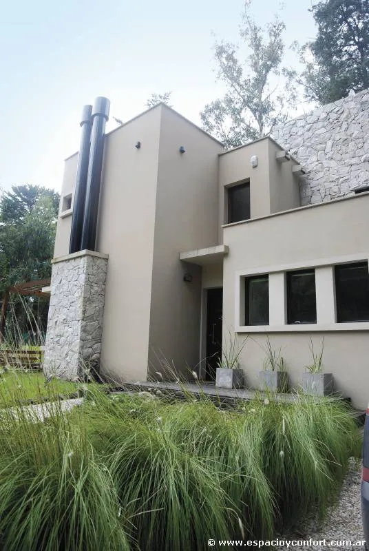Sus fachadas, con diversas caladuras, se expresan a través del color, la textura y la fuerza de los materiales que revisten planos y volúmenes. Figuras plásticas, de pura simplicidad geométrica, que se cierran y se abren a un paisaje natural que todo lo envuelve y lo abraza. Un conjunto que no sólo mira hacia una acuarela de verdes sino que permite una vida familiar en función a un exterior impactante.
