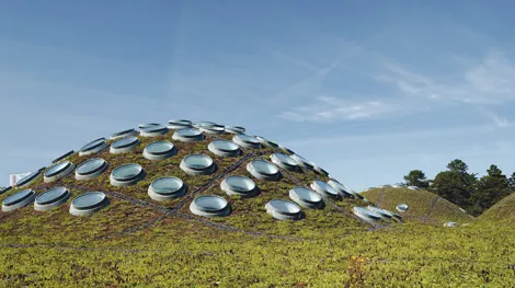 El edificio se camufla con su entorno, elevándose sobre un verde césped que lo dota de un “techo viviente” que mantiene siempre fresco el interior y recoge alrededor de 13 millones de litros de agua al año. En esta cubierta verde se forma un jardín que se estructura en torno a una red de piedras colocadas sobre una malla metálica, que es lo que permite drenar el agua y recolectarla para su reutilización.