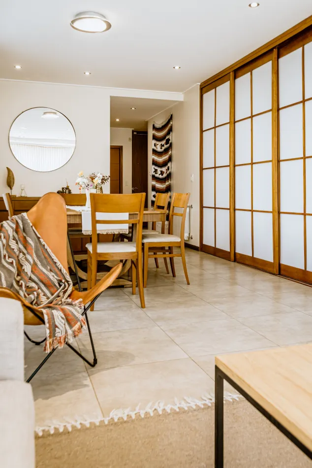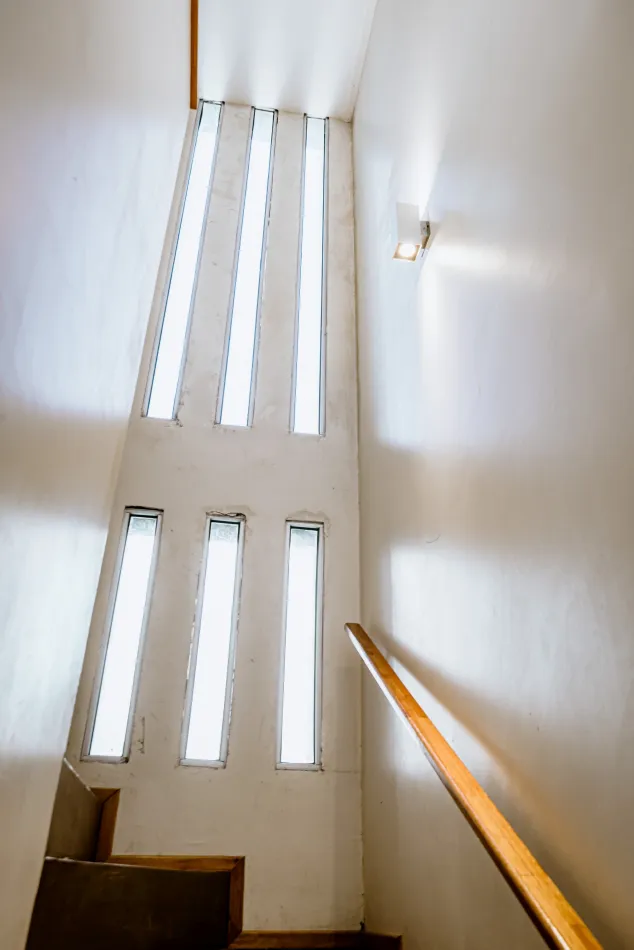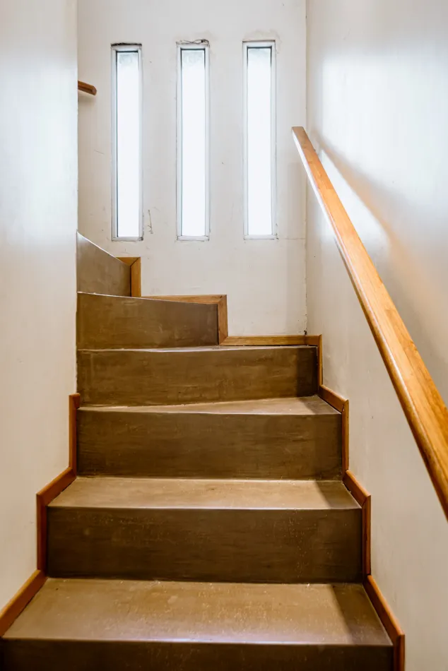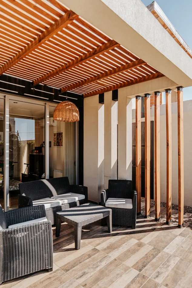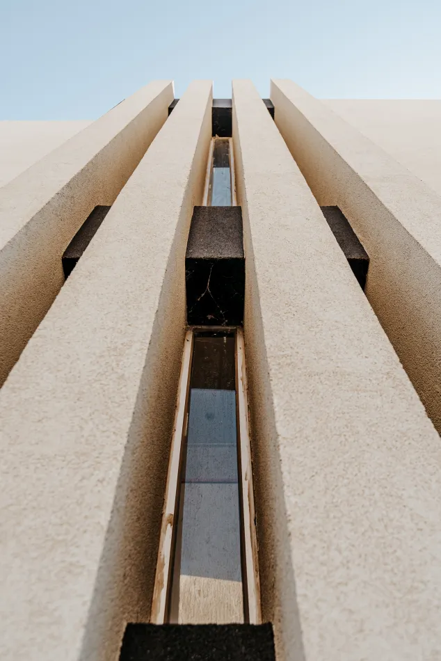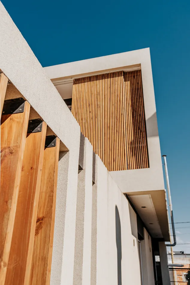 Hacia la calle y el fondo propio de la vivienda, cada una de estas cajas, que contiene una estancia, enmarca una piel de parasoles de madera, corredizos, que son muy característicos de la vivienda, y le proporcionan privacidad, aislamiento térmico y acústico, y un dinamismo que permite tener una fachada en movimiento, según el uso y las horas del día.