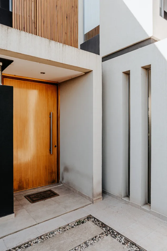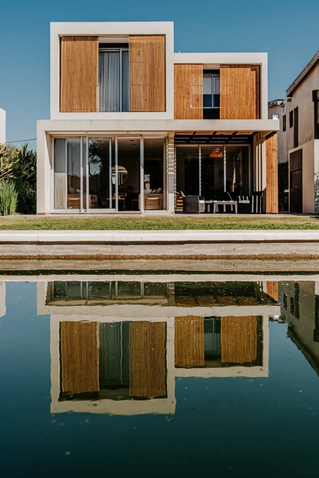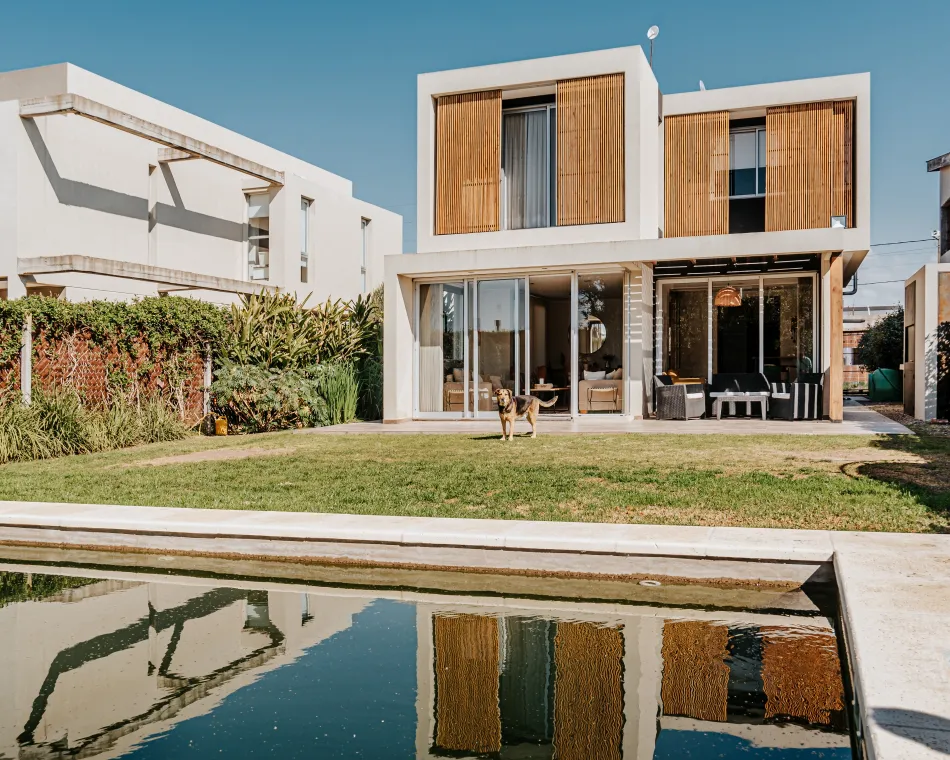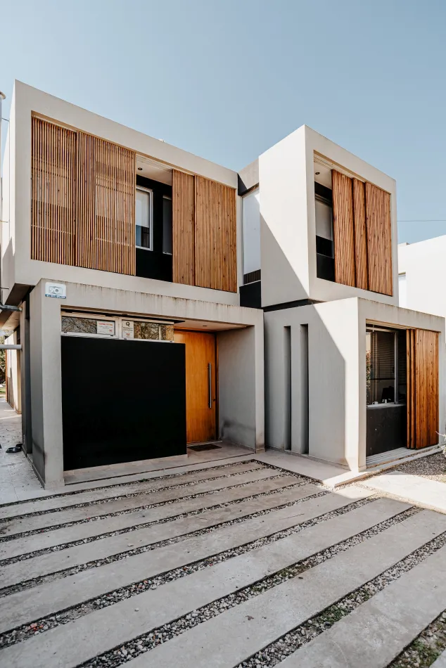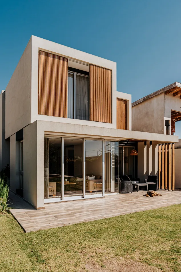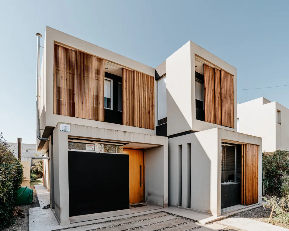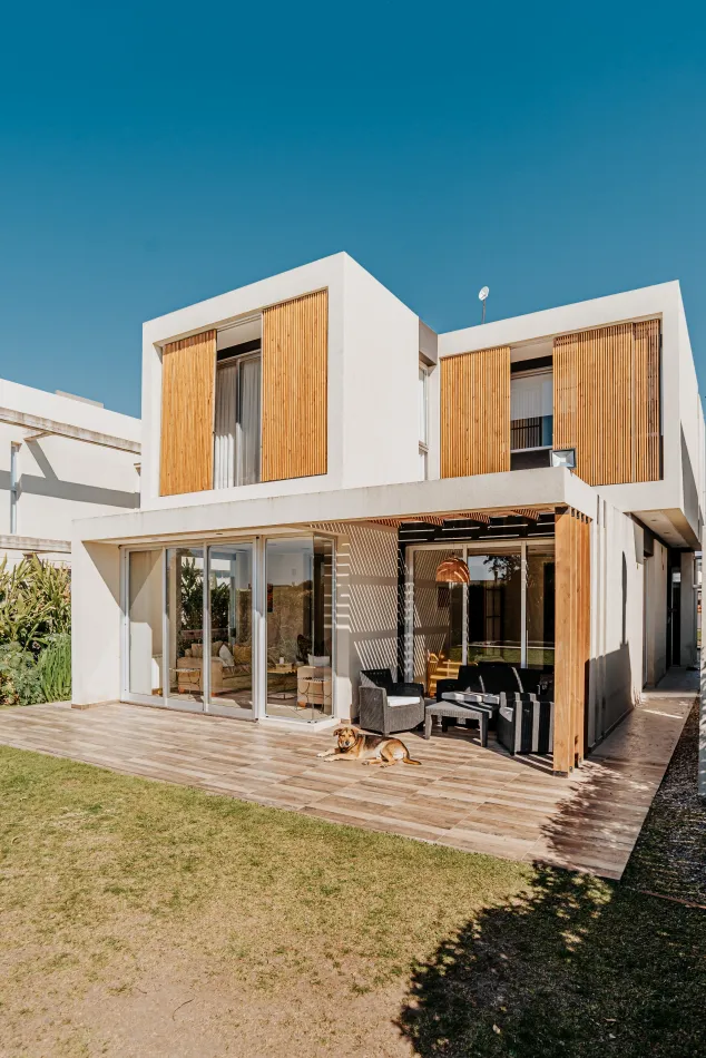 Respecto de la elección de materiales, es una vivienda construida con materiales tradicionales, hormigón, mampostería y frentes acristalados, que se complementan con este sistema de parasoles móviles tan distintivo dando por resultado una imagen moderna y cálida a la vez.