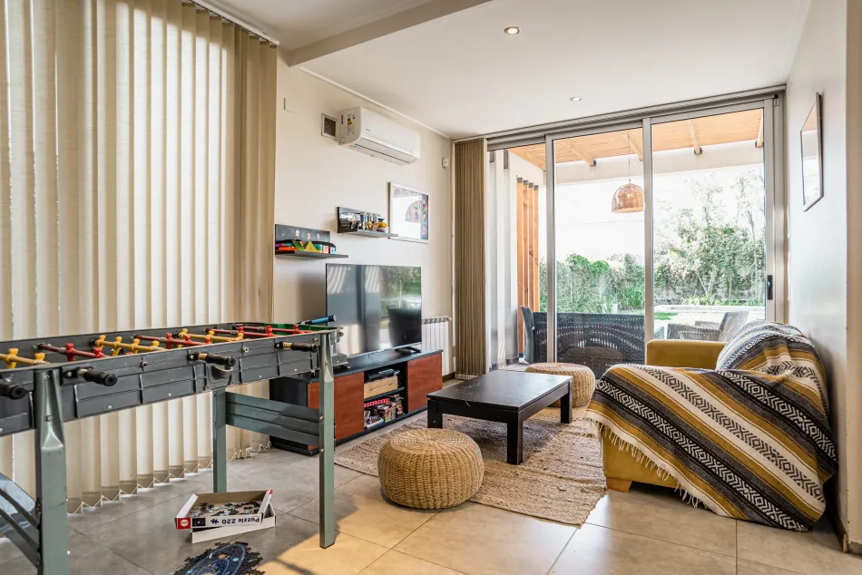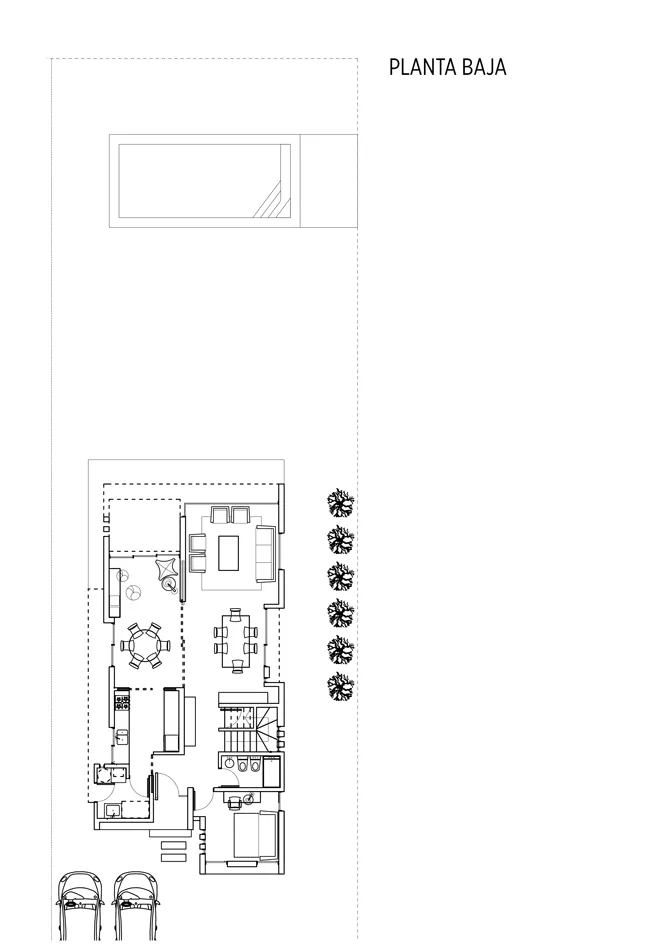 La planta baja se dispone de manera tal que permita la mayor flexibilidad posible en sus usos, en ese sentido, próximo al ingreso a la vivienda aparece un estudio que en algunas oportunidades se transforma en cuarto de huéspedes; y el área de play room, a continuación del comedor diario puede separarse a través de un cerramiento plegable del estar de la vivienda, admitiendo en simultáneo el uso de varios ambientes independientes, incluso teniendo cada uno sus propias expansiones.