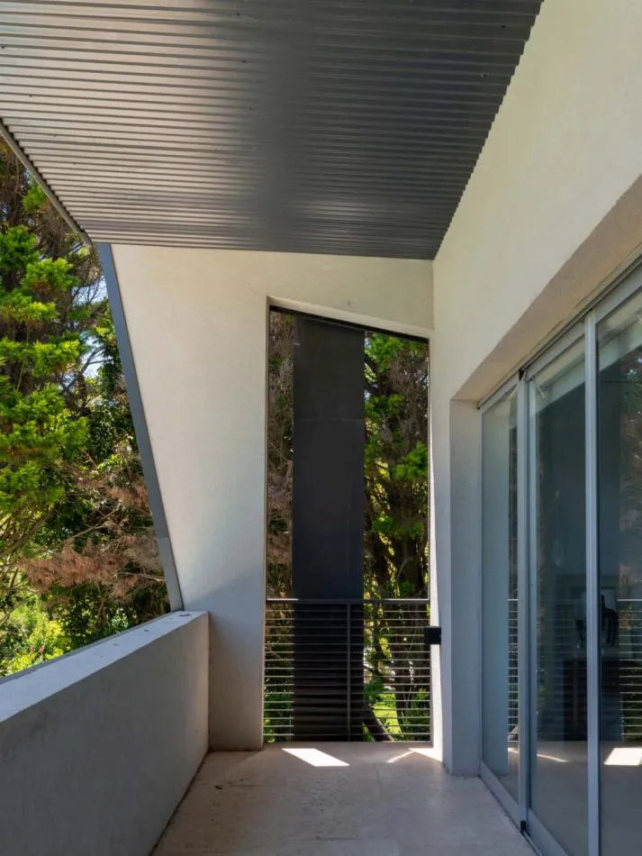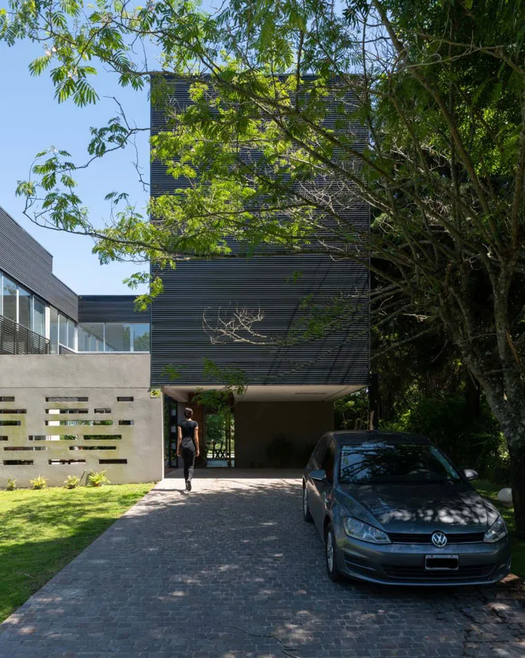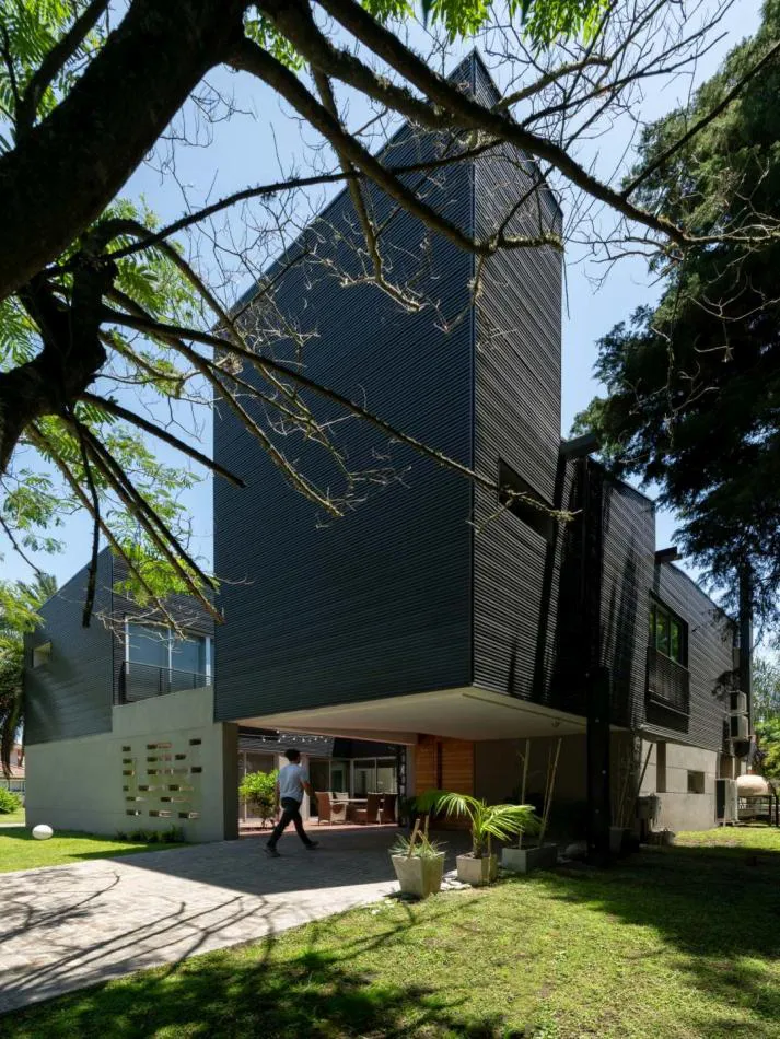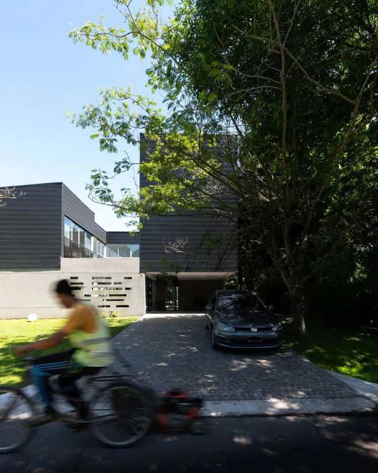 La materialidad de la casa busca simplicidad constructiva con un lenguaje austero y contemporáneo. Chapa, hormigón visto y revoques, todo en tono de grises.