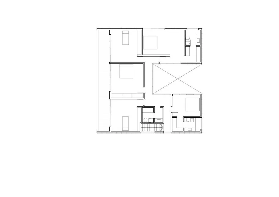 Un patio como corazón del proyecto conforma el acceso, sirve de articulador al recorrido de la vivienda y de uso, fresco en verano, gracias a la sombra arrojada por la proyección de la casa. El mismo en planta baja permite una buena ventilación cruzada en el área de comedor, como también el resto de los programas que lo rodean. En la planta alta el patio genera el recorrido hacia los dormitorios favoreciendo una correcta ventilación e iluminación de los dormitorios principales.