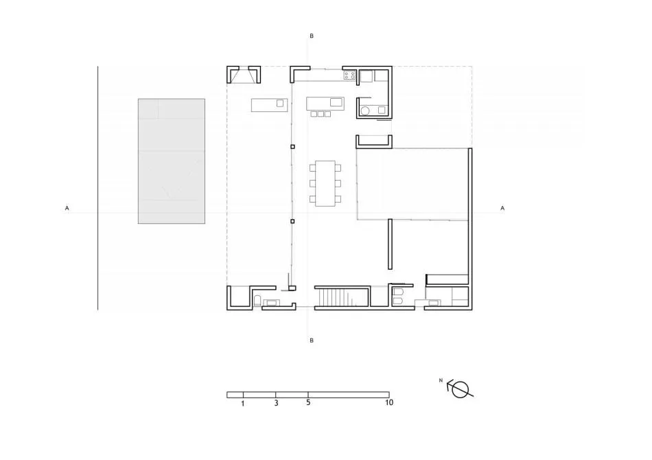 Los servicios y la escalera, en planta baja, se llevaron hacia los bordes este y oeste, favoreciendo la generación de una planta baja libre con clara expansión norte. La losa de hormigón encofrada en madera de pino acentúa la relación e integración del estar-comedor-cocina a la vez que se liberan los bordes laterales norte-sur. La casa se proyecta y se protege hacia el lado del recorrido del sol.