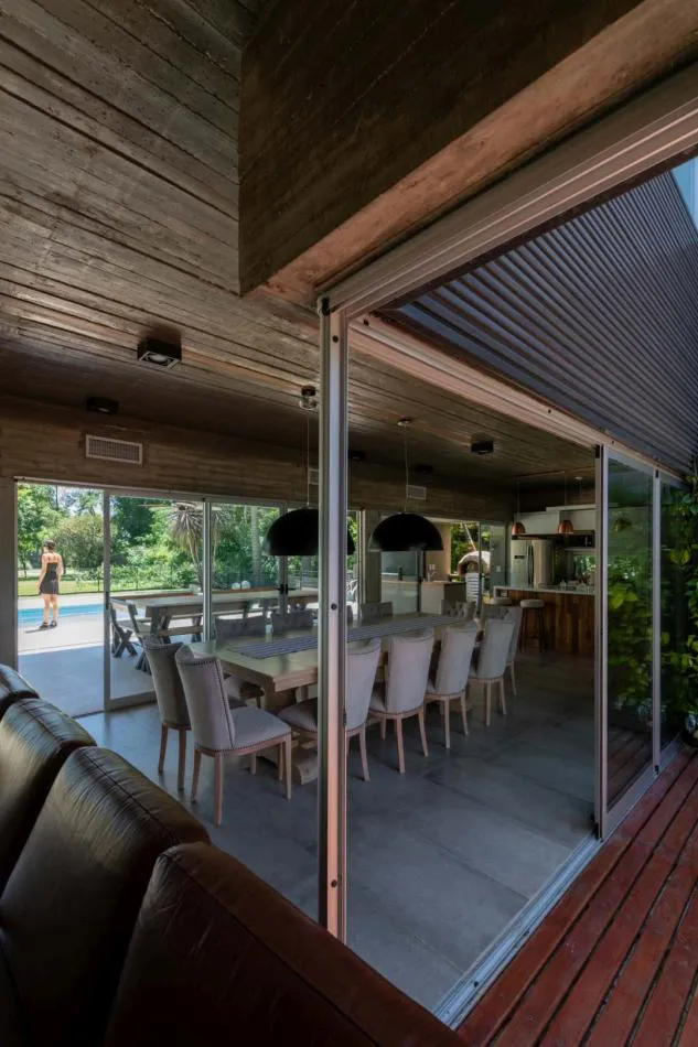 El sector de galería, que protege del sol en verano, es aprovechado como quincho. Es contiguo a las áreas comunes de la casa, favoreciendo la incorporación de esta área con el espacio interior.