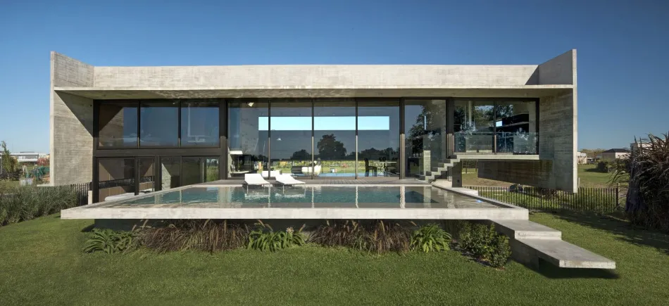 Escobar. Obra del Arq. Luciano Kruk, esta vivienda ubicada en un barriocerrado propone una materialidad simple e imponente a la vez, dejando que lasvistas, la luz y los espacios se conjuguen en perfecta síntesis.