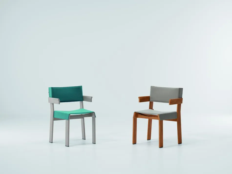 La diseñadora proyectó un objeto concebido con un ensamblaje de piezas. El diseño del sillón desafía intencionalmente las líneas sofisticadas clásicas de diseño de muebles y se convierte en algo esquemático, un programa conceptual. Una estructura formada por geometrías angulares repetitivas que expresan los materiales en bruto y que puede realizarse enteramente en aluminio o madera de Teka, Terrain Fabrics. La colección se compone de sillón comedor y sillón club.