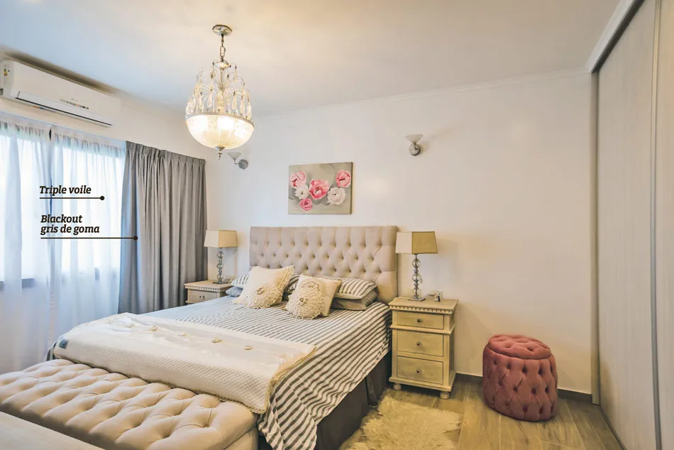 Para la habitación principal se utilizó un riel americano con tela de blackout gris de goma, y hacia el exterior se eligió un triple voile. Para el diseño se eligió la terminación con frunce. La idea fue oscuridad total en un ventanal de punta a punta, usando rieles con bastones.
