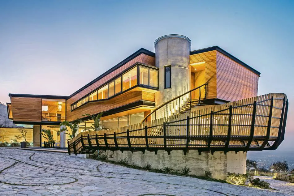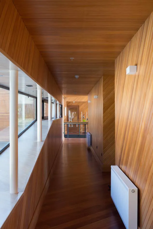 En el segundo piso se configura el volumen de dormitorios. A diferencia de lo orgánico de los niveles inferiores, este volumen racional de acero revestido en maderas nativas se define como un gran pasillo al sur, dejando todos los dormitorios y recintos habitables mirando directamente al valle.