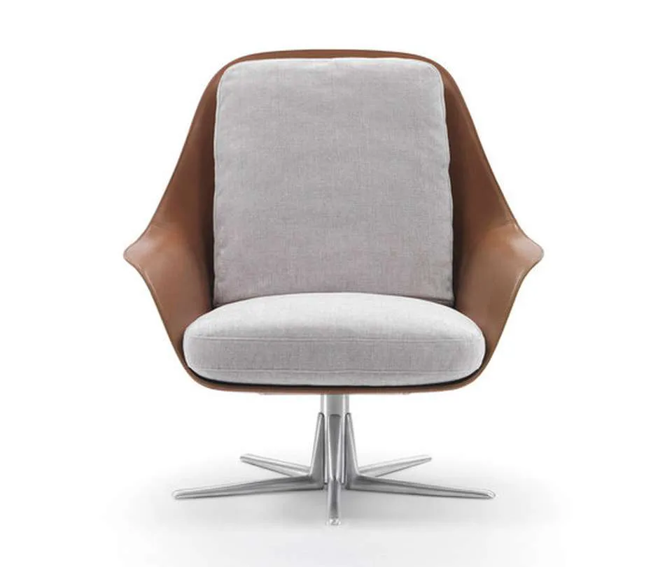 Compuesto por una carcasa de poliuretano estructural rígido y recubierto de cuero, los almohadones del asiento y el respaldo están rellenos con pluma de ganso.