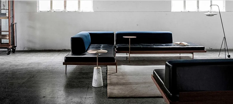 Apoyada en delicadas patas de metal, la plataforma de madera parece flotar por encima del suelo.