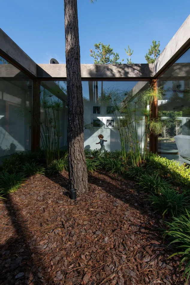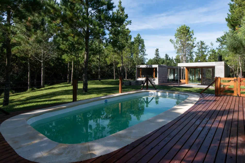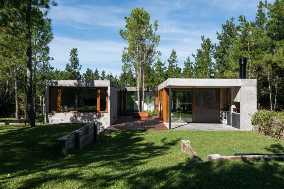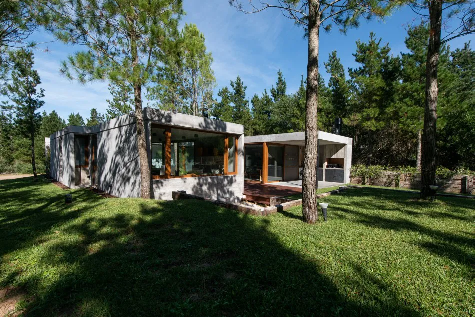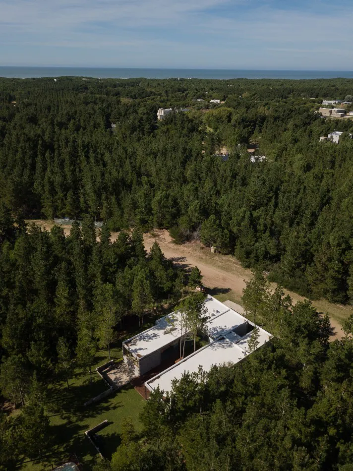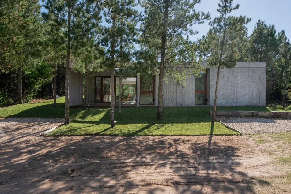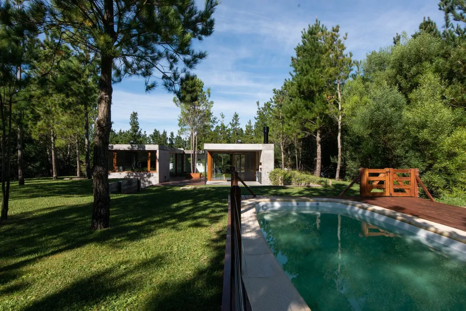Ubicada en el Barrio Senderos IV de Costa Esmeralda, esta casa de una sola planta se ubica en un área relativamente llana que cuenta con un denso bosque de pinos jóvenes.