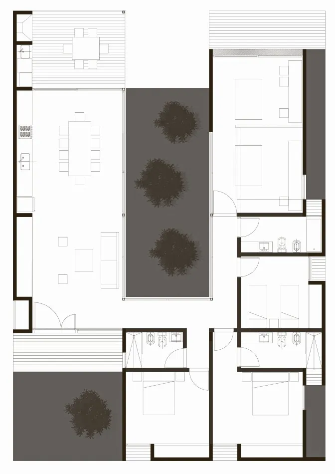 El proyecto se implantó en un terreno con una leve pendiente ascendente desde la calle , en el que se definen tres niveles de suelo que demarcan el espacio del parque, el fogón y la piscina, siempre respetando la vegetación existente.
