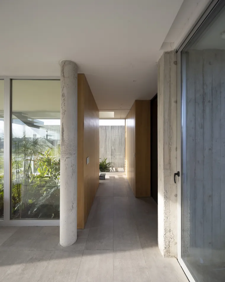 En la planta baja se encuentra el sector social: living, comedor y la cocina que se despega del resto y queda enmarcado con dos patios laterales, y genera a su vez un espacio semicubierto para el uso de la parrilla. Se intenta preservar las vistas al terreno en todas sus caras, para eso la piel de vidrio que la cubre en casi toda su totalidad. Detrás del muro de hormigón del frente se aloja un jardín cubierto por plantas, de esta manera se logra tener ventilación cruzada enfrentada y a su vez el muro de hormigón que lo contiene le da intimidad a la vivienda de la calle vehicular de la zona.