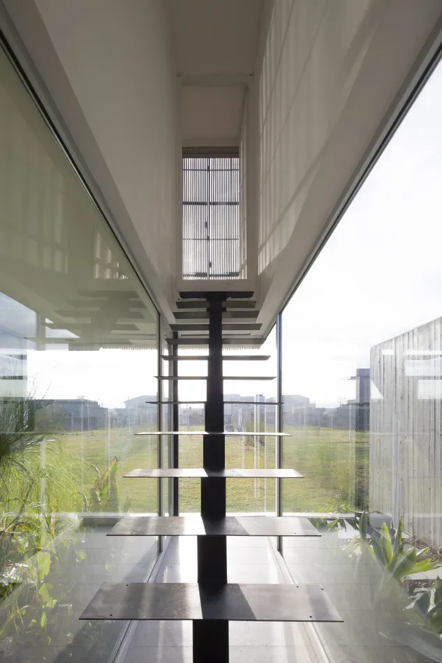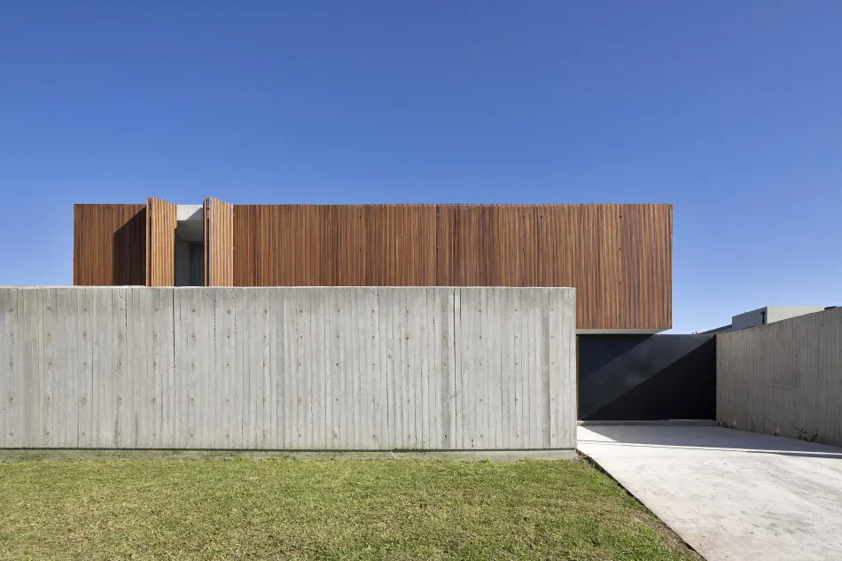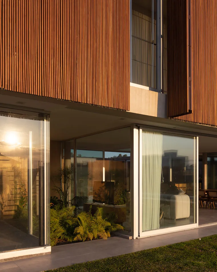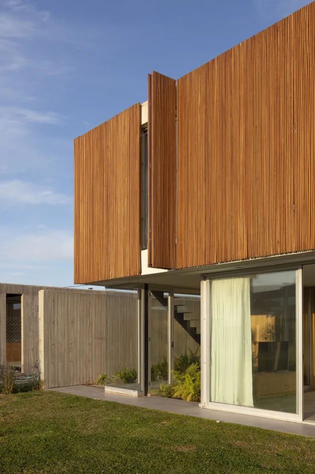 Esta caja de nivel superior contiene al sector privado de la vivienda (dormitorios, baños, vestidor y estudio) con ventanas de piso a techo que perforan en su totalidad los dos frentes y la madera de los parasoles en sentido vertical de sus tablas, con la posibilidad de su apertura, sombrean el interior sin bloquear la luz, generando un efecto de luces y sombras que cambia según el horario y posición del sol durante el día.