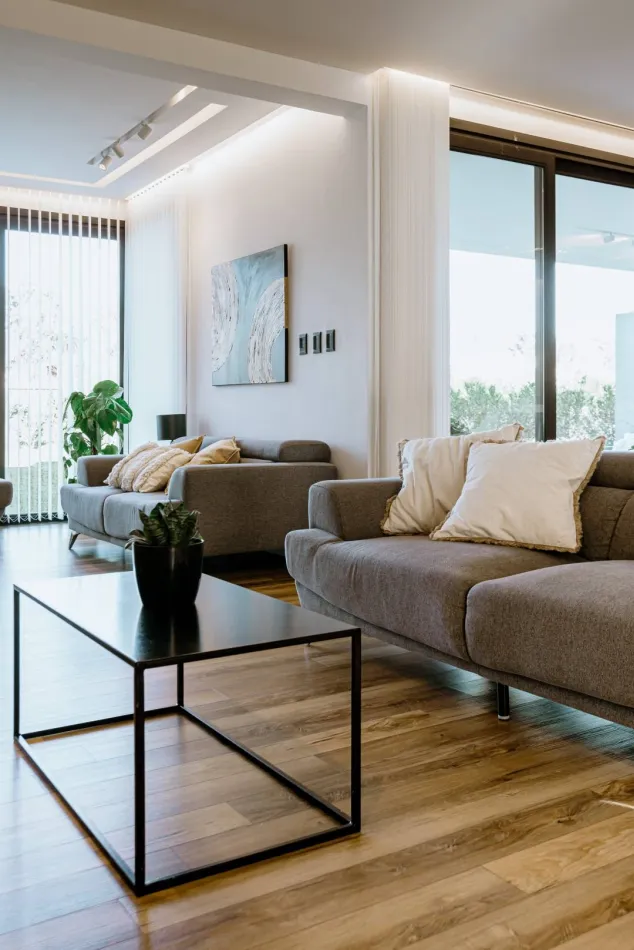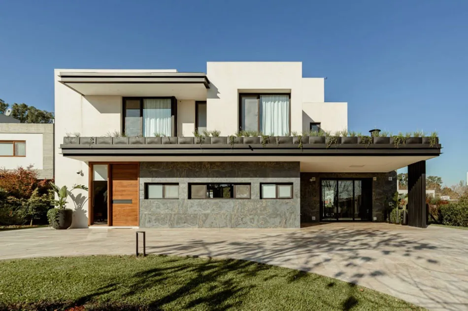 La planta baja de esta casa se destaca por sus espacios integrados y muy abiertos que expanden hacia afuera mediante aleros construidos con una estructura perimetral metálica que proporcionan semicubiertos como el garaje hacia adelante y la galería hacia el fondo. Un quincho con parrilla de cómodas proporciones vincula estos dos espacios y esa unión se verifica incluso en la continuidad de sus pisos de travertino.